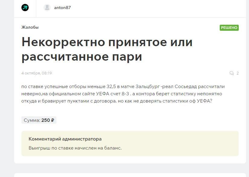 Здравствуйте. В том жалобе БК решила начислить выигрыш игроку в индивидуальном порядке в виде исключения. В данном случае контора решила придерживаться расчету по данным Whoscored. Хотя в правилах основным источником расчета для этих рынков указан сайт УЕФА и ранее расчет всегда производился по нему.