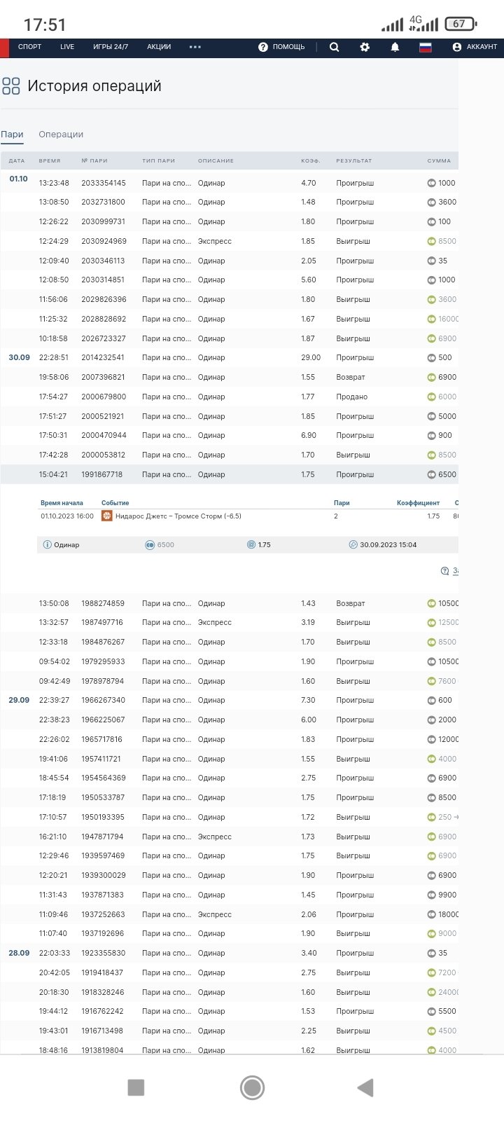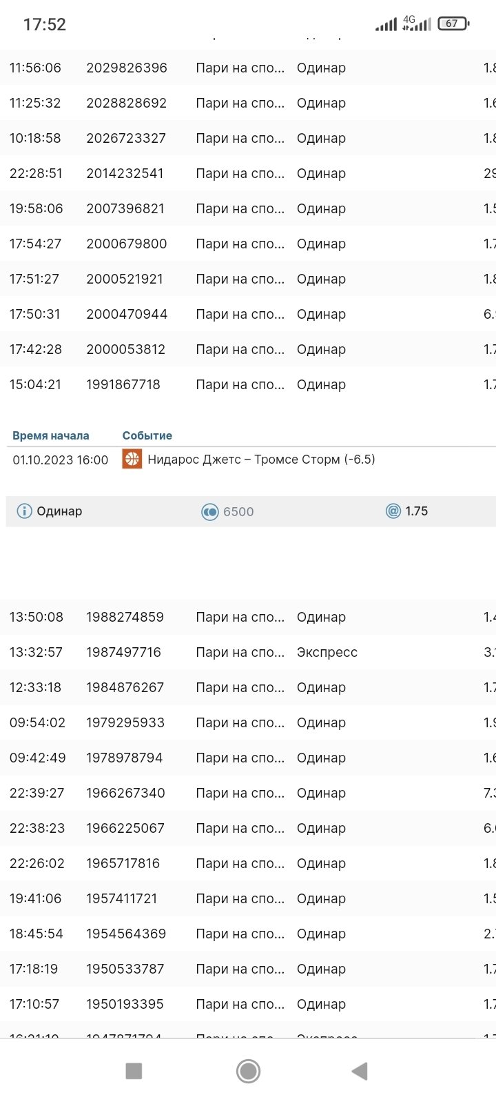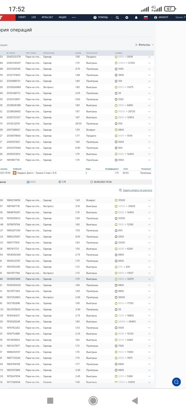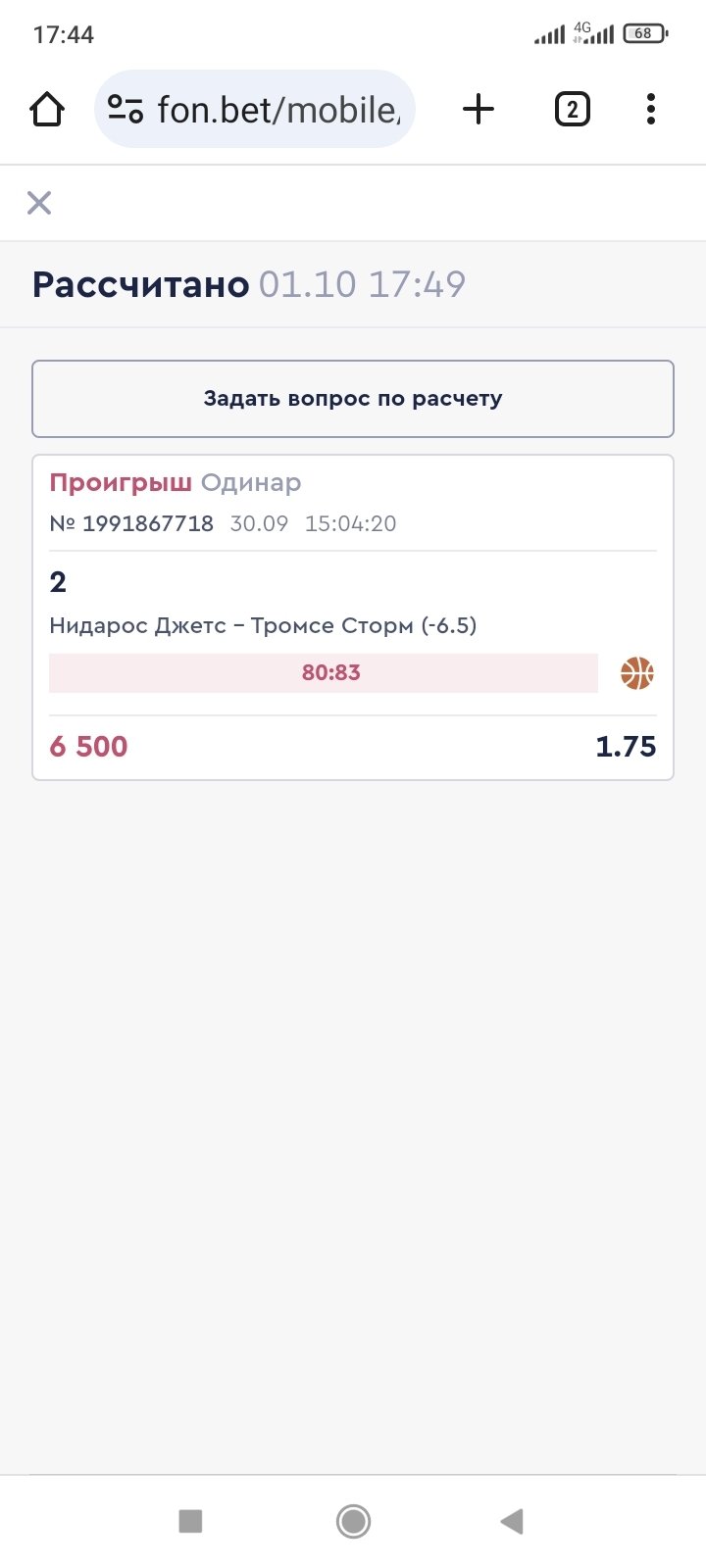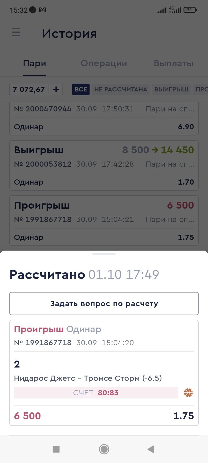 в 15-04 сделал ставку: Баскетбол, чемпионат Норвегии: Нидарос Джетс - Тромсе Сторм ф2 -6, 5. Матч завершился со счетом 64:83, ставку рассчитали в плюс. захожу в аккаунт и смотрю что ставка проиграла 80-83. Это как вообще понимать? Дело в том, что команды играли спаренный тур, два матча с разницей сутки и Фон начудил с расчётом, посчитав результат второго матча за первый. Надо бы разобраться. Во-первых, 30-09 в 15-04, когда была сделана ставка, любая БК не могла принимать ставки на второй матч, не зная результата первого, ибо линия строиться на основе личной встречи, а результата первого матча не было известен. Во-вторых, согласно архива линий БК, линия на второй матч вышла лишь в 08-40 1 октября, то есть физически поставить на этот матч я не мог. В-третьих, фора на второй матч была -11, 5-12, 5 и поставить -6, 5 за 1,75 я не мог. Скриншоты прилагаю, по ним видно, что после результата первого матча букмекер скорректировал фору на команды. Почему Фон не признаёт свою ошибку? Ну не может БК принимать на второй мат, не знаю результата первого, тем более рассчитав в плюс ставку. Прошу помочь.