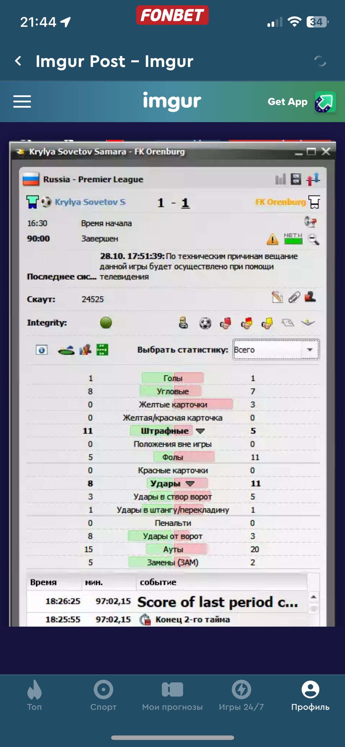 Матч Крылья советов-Оренбург всего ударов больше 25,5. Во всех источниках в том числе на сайте РПЛ ударов на много больше, а в фонбете 21. В правилах бк фонбет официальный источник указан сайт РПЛ.