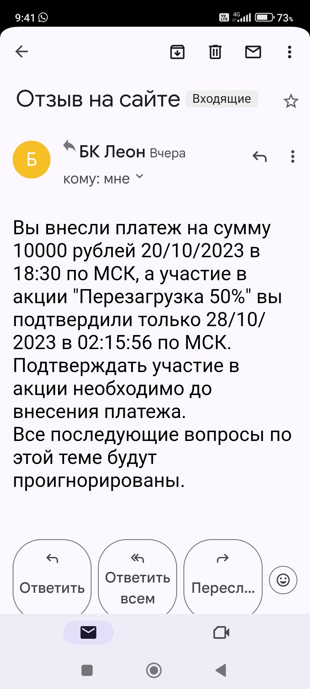 Нечего подобного ,С моей стороны всё было согласно требованиям акции. Чтобы не было таких ситуаций .Надо писать в правилах чтобы клиент делал скрин чтобы не было таких ситуаций. Это упущение БК ЛЕОН, Почему должен страдать клиент?
