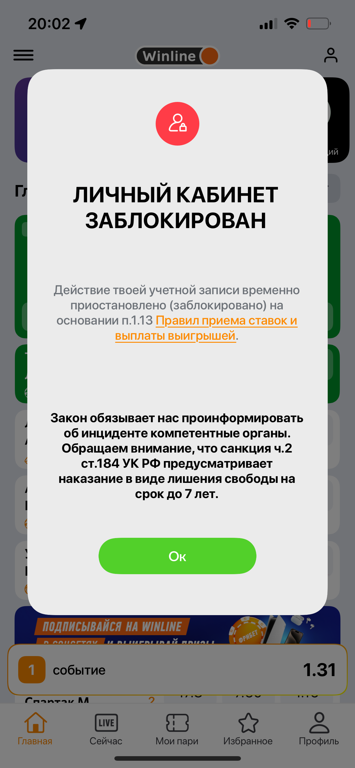 По информации от букмекера, на текущий момент проводится проверка по соблюдению правил Честной игры. Аккаунт заблокирован на срок до 1 года, согласно п.п. 1.13. Подробной информации, аргументирующей причины блокировки аккаунта, букмекером не предоставлено.