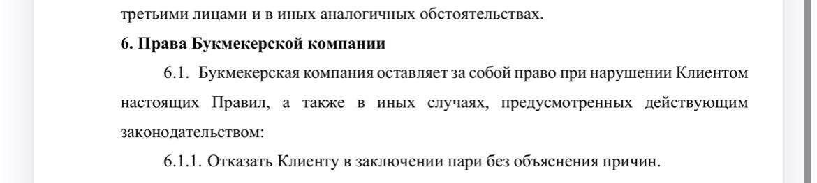 Здравствуйте. Прошу разобраться в беспределе. Точную дату, когда это все началось, я не помню.. Когда то в октябре. Я завел деньги 100тыс, поставил на доту, мне дали возврат, они отминусовали деньги за то, что рассчитали ставку в прошлый раз сначала выигрышной, а потом решили , что она не выигрышная. и назначили вериф, деньги я свои естественно не смог вывести. Я сходил в ППС на следующий день, подтвердил личность, написал заявление на вывод средств. Позвонил на горячую линию, создали обращение. Прошло дохрена дней и пришла смс, что мой аккаунт заблокировали и МОИ же деньги мне не дадут вывести. И плюс мой баланс резко стал минус 6 тысяч. Это че ща хренотень???Они ссылаются на пункта 6.1.1. Причем тут пари и то, что они украли мои деньги? Это же воровство, чистой воды.