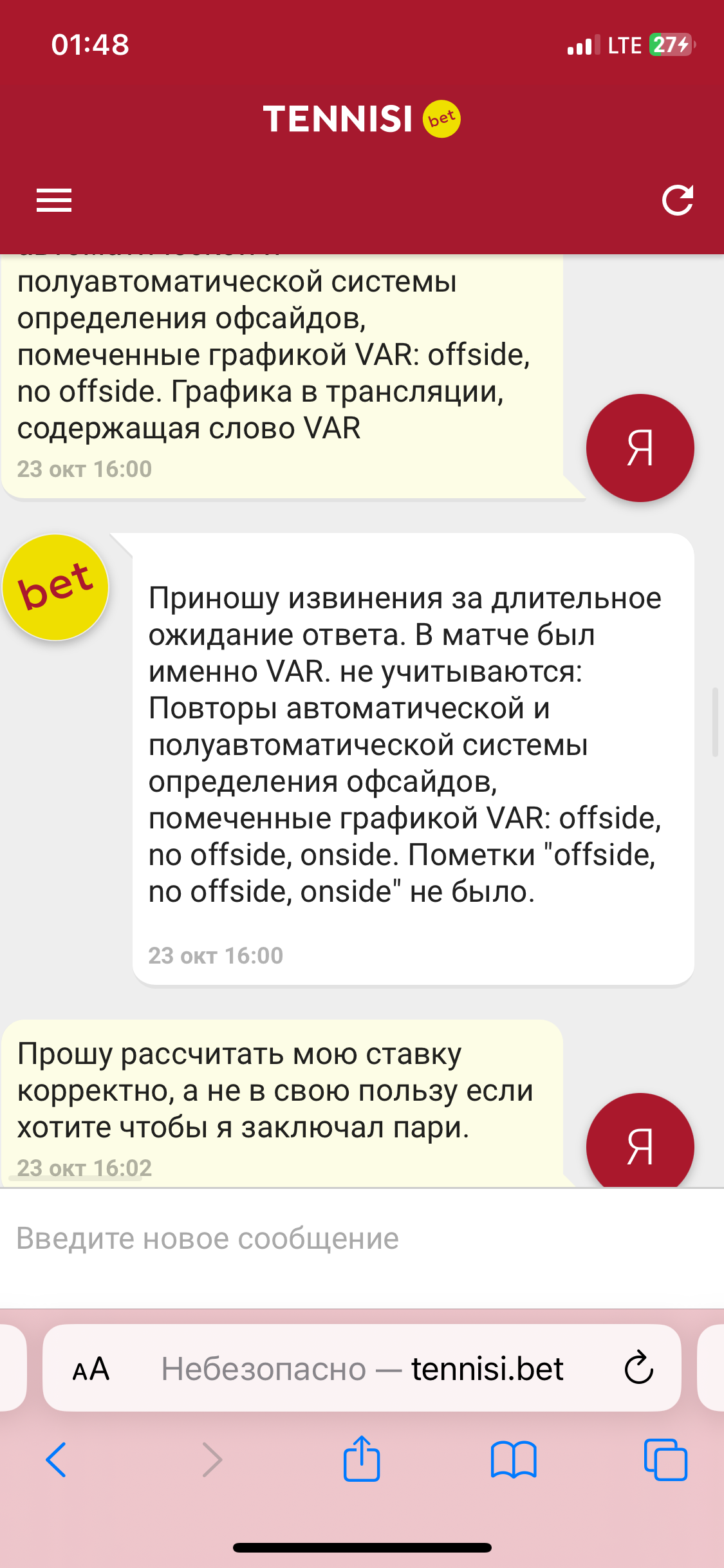 Доброго времени суток, Уважаемая Администрация ЛегалбетПрошу рассмотреть ординар от В матче Брагантино : Флуминенсе была сделана ставка «В матче будет использован видеоповтор VAR — Нет”Вот ссылка на матч: …Время на видео 1:58:58 на данном эпизоде видно что нападющий находится в метровом офсайде , игрок забивает но радости на его лице нет , игроках команды тоже , фактически момент был доигран после поднятия боковым арбитром флажка, из-за шума он доиграл этот момент.Прикрепил правила букмекера первые два пункта не подходят(Личный просмотр главным арбитром эпизода на монитореVAR.Знак «прямоугольник», нарисованный главным арбитром в воздухе.)Графика в трансляции, содержащая слово VAR, относящаяся к спорному моменту и показанная строго в момент остановки игры.В другом пункте указано:Не учитываются следующие обращения к VAR:Повторы автоматической и полуавтоматической системы определения офсайдов, помеченные графикой VAR: offside,no offside, onside.Графика в трансляции, содержащая слово VAR, показанная после возобновления игры.«Тихая проверка» VAR. Главный арбитр ведет переговоры с судьямиVAR, но в трансляции не появляется графика, относящаяся к check, Penalty check, Red card check и т.д.Повторы автоматической системы определения пересечения мячом линии ворот.В данном эпизоде была задействована полуавтоматическая или автоматическая система определения офсайдов , т.е видно что игрок находился на момент передачи в более метровом офсайде, черным по белому у букмекера написаноНе учитываются следующие обращения к VAR:Повторы автоматической и полуавтоматической системы определения офсайдов, помеченные графикой VAR: offside,no offside, onside.