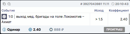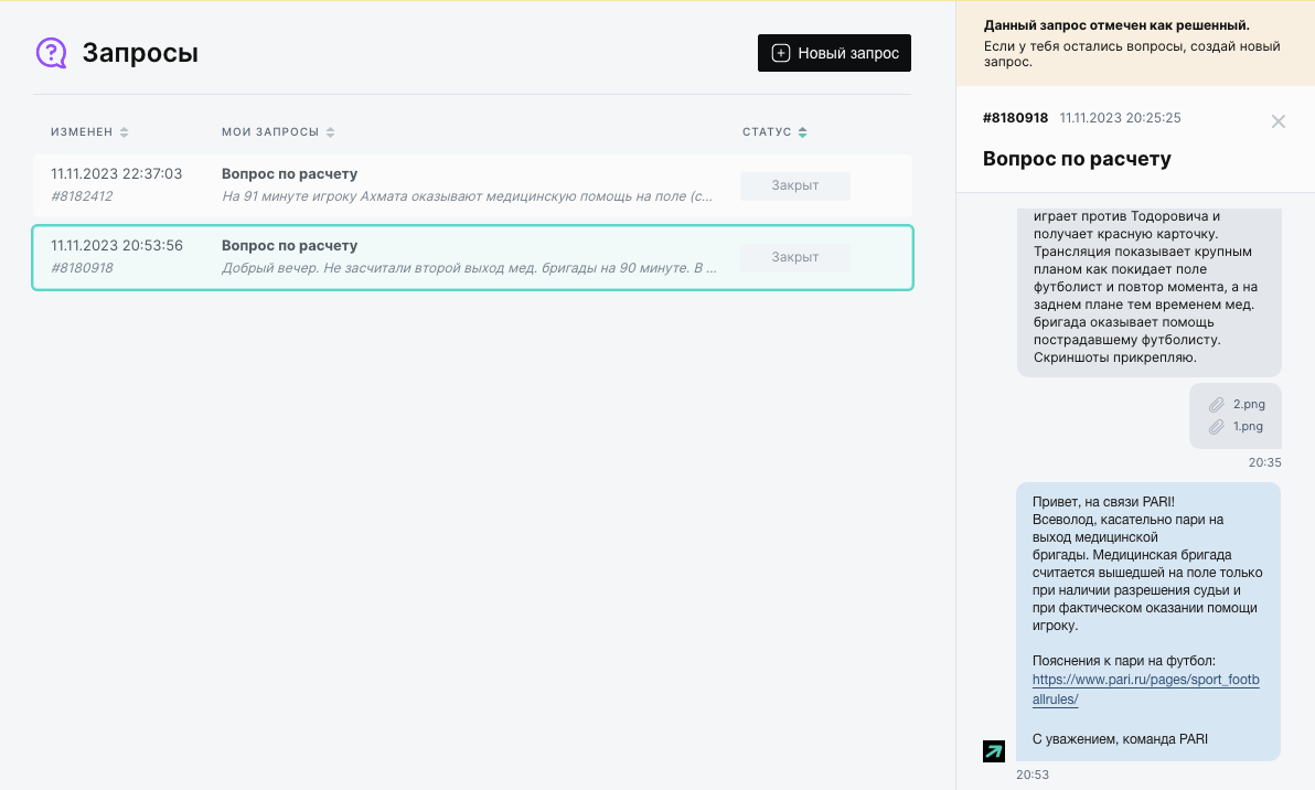 Здравствуйте. Было принято пари на 80 минуте матча Локомотив - Ахмат: выход мед. бригады на поле >(1.5). На 90 минуте матча игрок Ахмата получает травму, но из-за крупных планов и повторов моментов, выход мед. бригады остается за кадром трансляции. Мне удалось увидеть как на 90:24 по трансляции матча оказывается помощь игроку на поле (см. скриншоты 1,2). Далее, на 91:35, видно, как после розыгрыша стандартного положения, игрок просит главного судью выпустить его на поле (см. скриншот 3) и выходит спустя несколько секунд. Мною было составлено несколько запросов по расчету пари, но оба они закрыты с пометкой решено. Считаю, что пари рассчитано неверно, а факт выхода мед. бригады проигнорирован в лайв-линии. Помогите пожалуйста разобраться в данной ситуации.