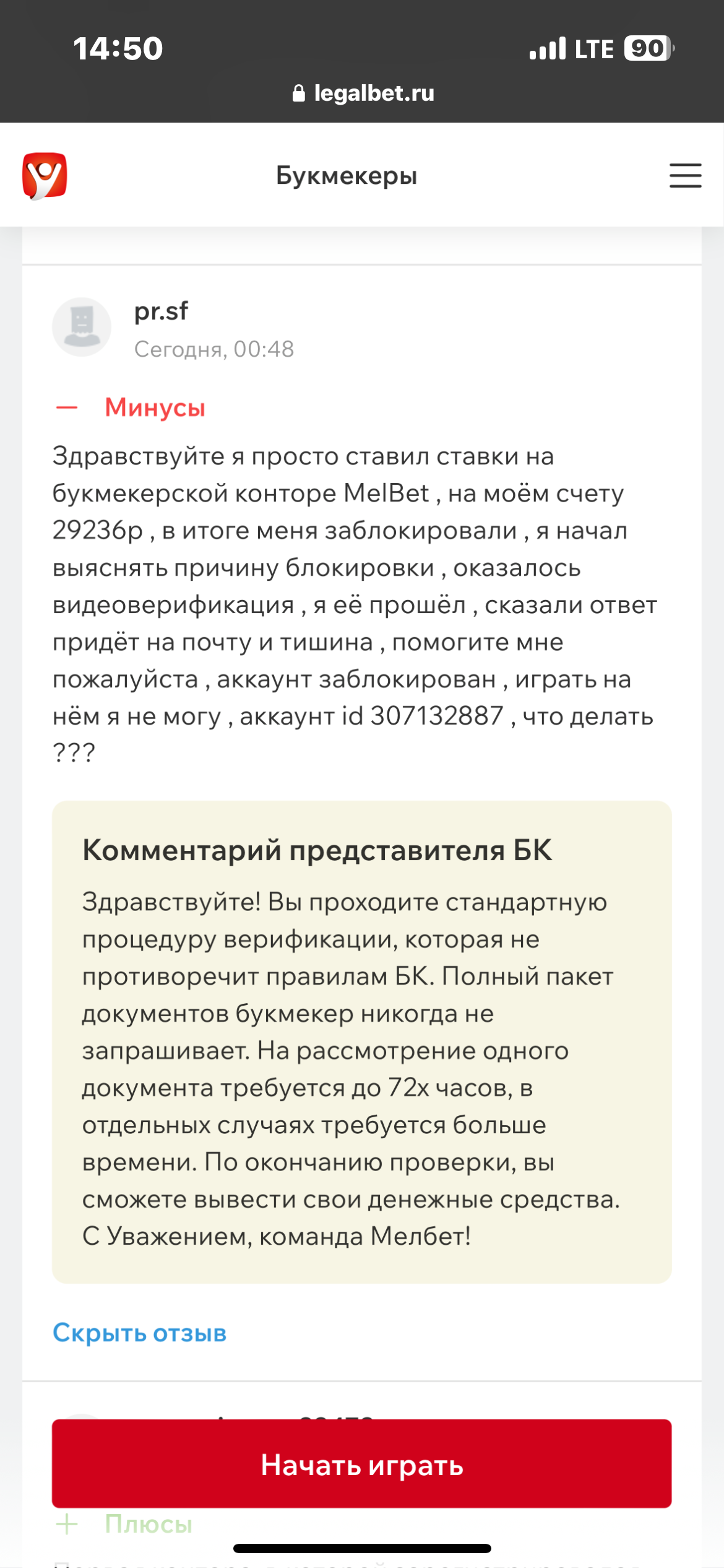 Здравствуйте я просто ставил ставки на букмекерской конторе MelBet , на моём счету 29236р , в итоге меня заблокировали , я начал выяснять причину блокировки , оказалось видеоверификация , я её прошёл , сказали ответ придёт на почту и тишина , помогите мне пожалуйста , аккаунт заблокирован , играть на нём я не могу , аккаунт id 307132887 , что делать ???
