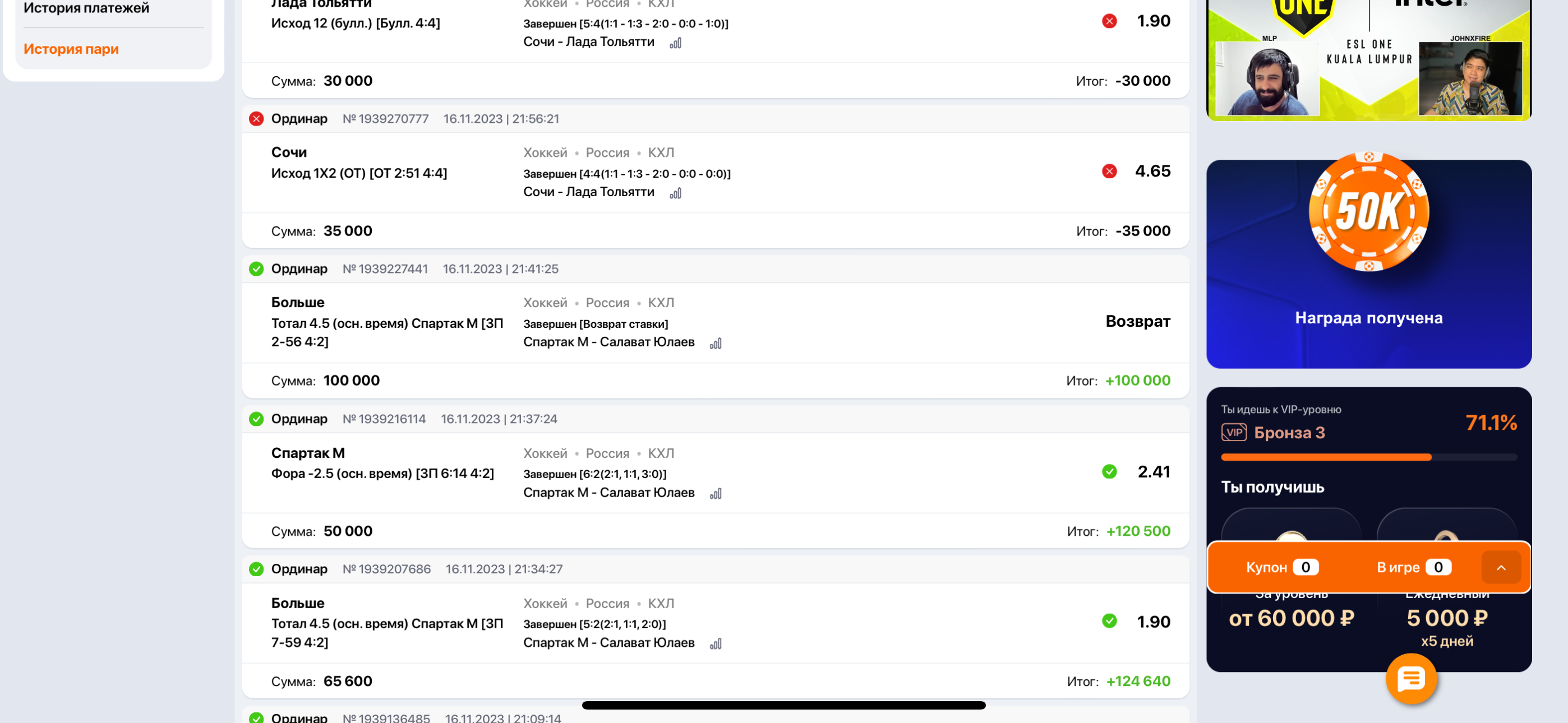 Хоккей Спартак Салават, поставила 100000 кф на гол спартака за 2:56 до конца. После этого была еще остановка минуты на 2, потом Спартак забивает. Ставка рассчитывается, я ставлю на вывод, мне режут сумму вывода с 595000 до 5000. После чего с баланса списывают выигранные 119000. Пишу в поддержку. Ответ: К сожалению, от поставщика мы получили неправильные коэффициенты, поэтому произошел перерасчет ставки. Недавно от меня была жалоба, когда они показывали время до конца периода в 2 раза больше, я проиграла 1 миллион. Это было норм. А сейчас что? Они там себе правила придумывают, какие хотят. Мне какая разница, что им там поставщик дал, я поставила. Ставка сыграла.