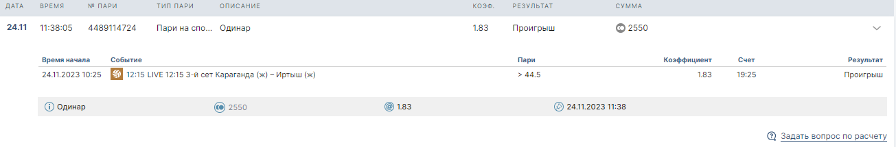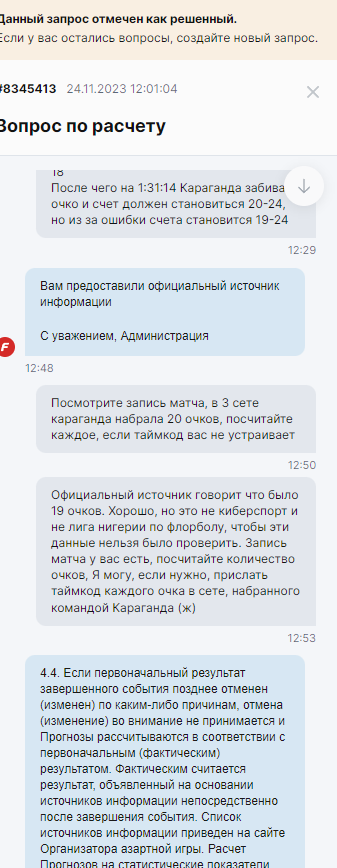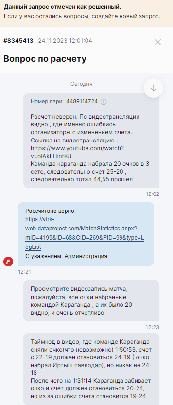 Матч национальный лиги РК по волейболу среди женских команд. 3 сет. Ставка на тотал 44,5 Б в 3 сете. Ведется официальная видеотрансляция ( матча. Команда Караганда(ж) приближается к сопернику, делая счет 18-19(таймкод 1:27:05), после чего проигрывает 2 очка подряд. Счёт 21-18 . После чего выигрывает очко (1:28:28). Счёт 21-19. После чего проигрывает 3 очка подряд- счет с 22-19 становится 24-19 ( задержка в изменении счёта) , но счёт становится 24-18(!) таймкод: 1:50:53. После чего Караганда (ж) забивает (1:31:14), и счёт должен становится 24-20, но становится 24-19 (ошибка в счёте). После чего проигрывает очко-счёт 25-20, что подходит для выигрыша ставки Тотал 3 сета 44.5Б, но на видеотрансляции счёт становится 25-19, что не подходит. Все очки , набранные командой Караганда (ж) в этом сете я отсмотрел, их 20. Никакой иной причины , кроме банальной ошибки быть не может, не было видеозапросов, не было ничего, что могло бы отнять очко у команды Караганда (ж) В связи с чем , верно было бы рассчитать счет сета - 25-20, соответственно и моё пари победой. В поддержке БК Фонбет предоставили протокол матча, ответив , что расчёт был произведен верно. Но учитывать то, что и протокол составляют люди БК никак не хочет. Посмотрите официальную запись игры, пожалуйста.