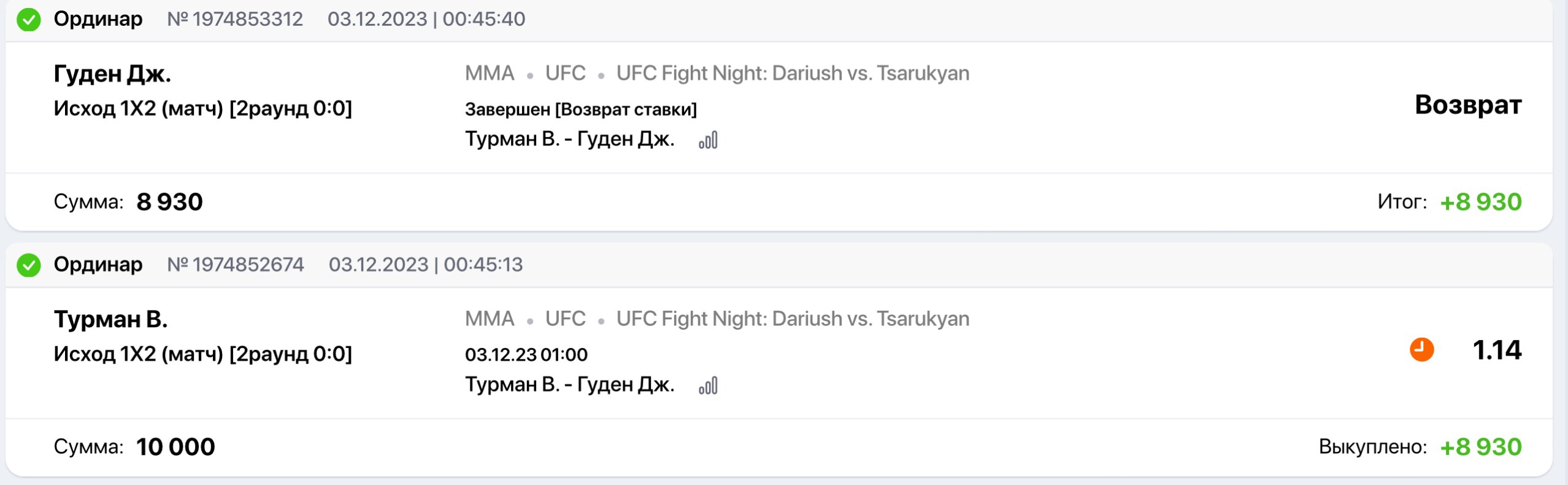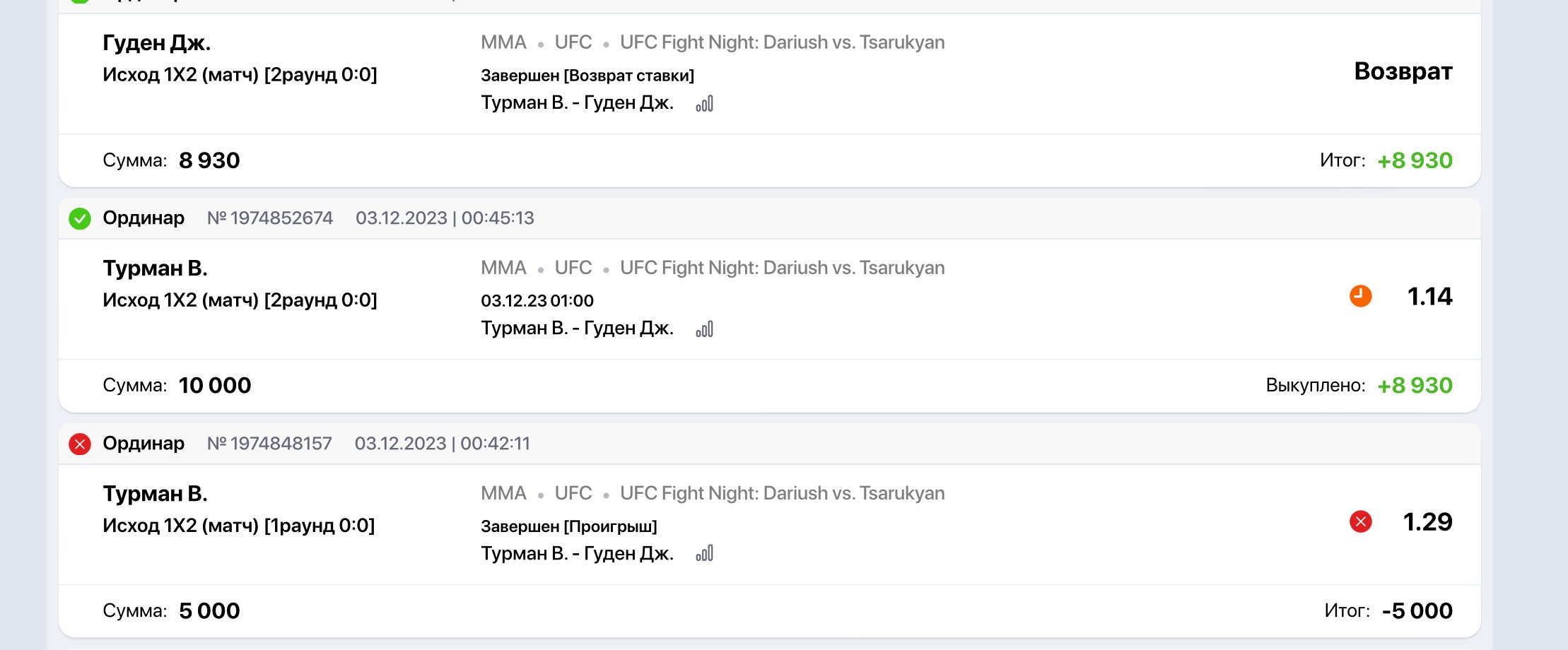 Также, хочу акцентировать ваше внимание, что перед этими ставками, я так же поставил 5.000 руб на ЭТОТ ЖЕ БОЙ в лайве, но мне естественно возврат за этот проигрыш не сделали, а это означает, что возврат в данном бою абсолютно не уместен!