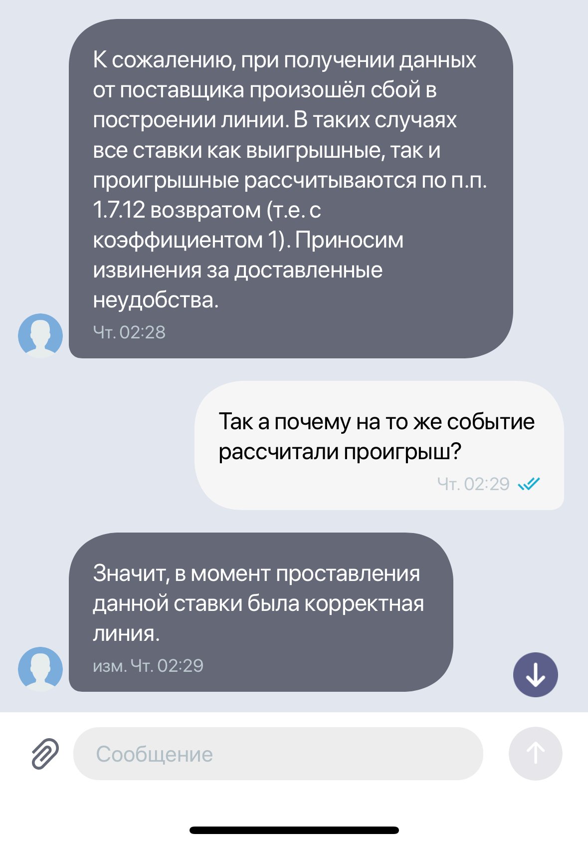 Я делал ставку в режиме ЛАЙВ на победу бойца, после чего мне делают возврат, объясняя тем что некорректно была дана ЛИНИЯ. Но ведь я делал ставку именно в лайве, и никаких проблем не было до этого. В онлайн чате в приложении они убрали прямую связь с оператором, только ответы от бота, без возможности вступить в диалог! Не отвечают на звонки. Пишу им на почту, приходит автоответ, чтобы на почту нельзя обратиться! другими словами обрубили обратную связь ! Скриншоты прикрепляю. Требую вернуть оставшуюся сумму в размере рубль!