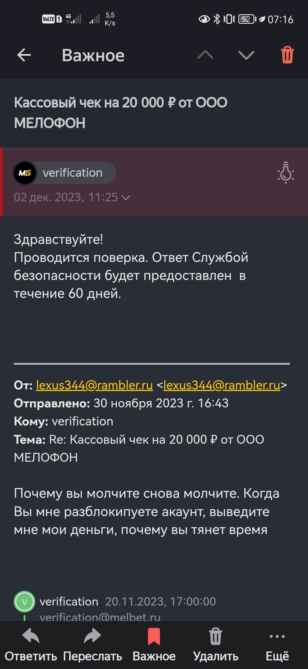 После 5 ставок заблокировали после чего месяц отправляю им документы отвечают спустя день или больше. За этот месяц прошёл все процедуры по итогу 2 Декабря 2023 получил письмо что в течении 60 дней проходит проверка. Итого 90 дней. Прошу помочь.