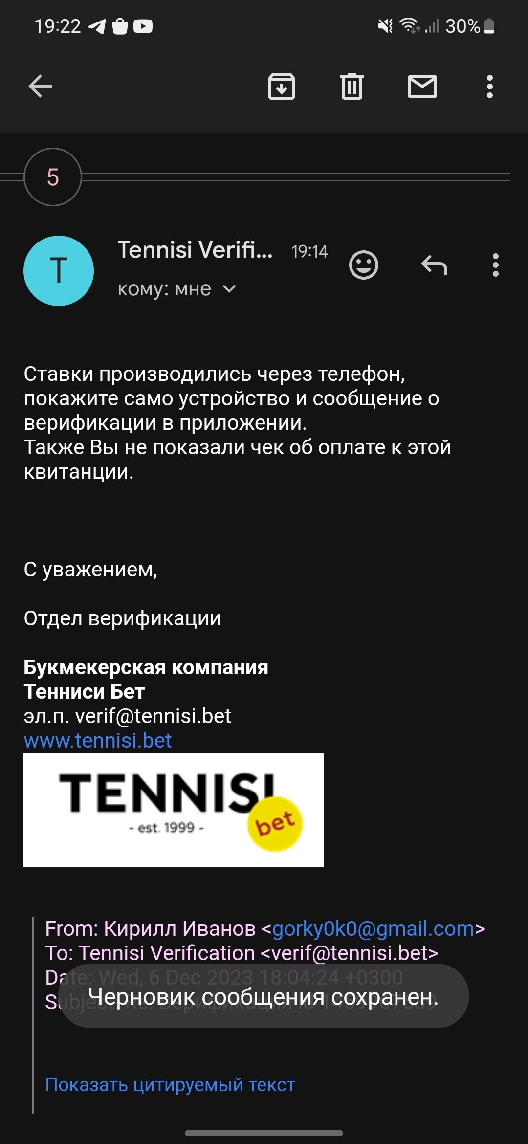 Доброго времени суток. Пишу вам с просьбой помочь. Столкнулся с проблемой на БК Теннис Бет. Сделал одну ставку и далее хотел вывести средства. Попросили пройти процедуру верификации. Убрали все возможности вывода и требовали видео на котором видно паспорт, квитанцию ЖКХ по прописке и моё лицо. Живу и учусь не в родном городе, не по месту прописки, обратился в службу безопасности с вопросом, что делать если квитанции физически нет под рукой. Разрешили отправить её фото, что я естественно сделал.Фото в хорошем разрешении, видно все QR и штрих-коды так что бы они сканировались, видно все уникальные номера (лицевого счёта и т.д.) На что получил ответ, что теперь требуется уже чек об оплате квитанции, а не квитанция, причем обязательно в печатном виде на видео, с печатью банка (оплачивалось всё в электронном виде). По скольку там не живу, оплачивали родственники, в чеке имя, фамилия, реквизиты родственника, публикации которых он категорически против.Так же букмекером поставленны временые рамки, после которых они счёт заблокируют.Очень прошу помочь. Никаких правил не нарушал, но выигрыш получить не могу. Предлагал службе безопасности прийти с любым личным документом в ППС, на что мне тоже отказали. Готов предоставить другие документы, лишь бы закрыть этот вопрос.