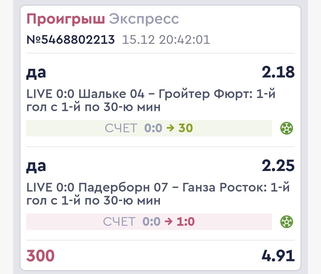Был матч бундеслиги2 патерборн-ганза, взял пари на гол до 30й минуты, матч прервали минут на 10, время остановили а Фонбет считал минуты, когда возобновили забили гол на 21й минуте а Фонбет засчитал на 31й, я писал в поддержку они ссылаются на источники в правилах, где указан сайт официальный бундеслиги2 и там 21я минута гола, но у фонбета есть ещё типа источники по которым они рпситывают, и типа в приоритете где гол засчитан на 31й минуте И второй источник где гол на 29й, в общем посмотрел в других БК в 3х до 30й минуты! И на сайте бундеслиги2 Официальный!Фонбет не рассчитал и даже не собирается