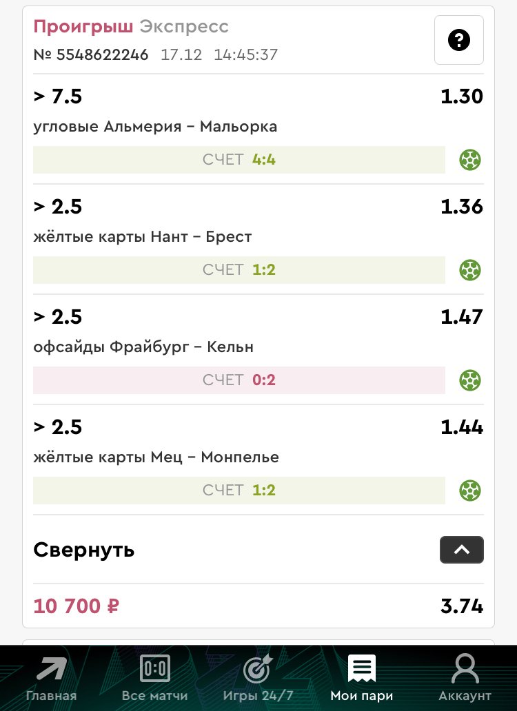 Ставил экспрессом(4 события). Матч Фрайбург-Кёльн тб офсайдов 2,5 больше, во всех источниках и в самом матче на трансляции было 0:3 по офсайдом, а пари засчитал как 0:2 и засчитал экспресс проигранным. Отправил запрос на рассмотрение мне ответили что они в праве выбирать источником результатов сайт на свой выбор согласно пункту 4.4 и скинули ссылку на сайт runningball где по статистике офсайдов было 0:2. Почитал про этот сайт что было как минимум 2 случая что этот сайт предоставлял неверные результаты матча букмекерам. Сумма выигрыша составляла 40018