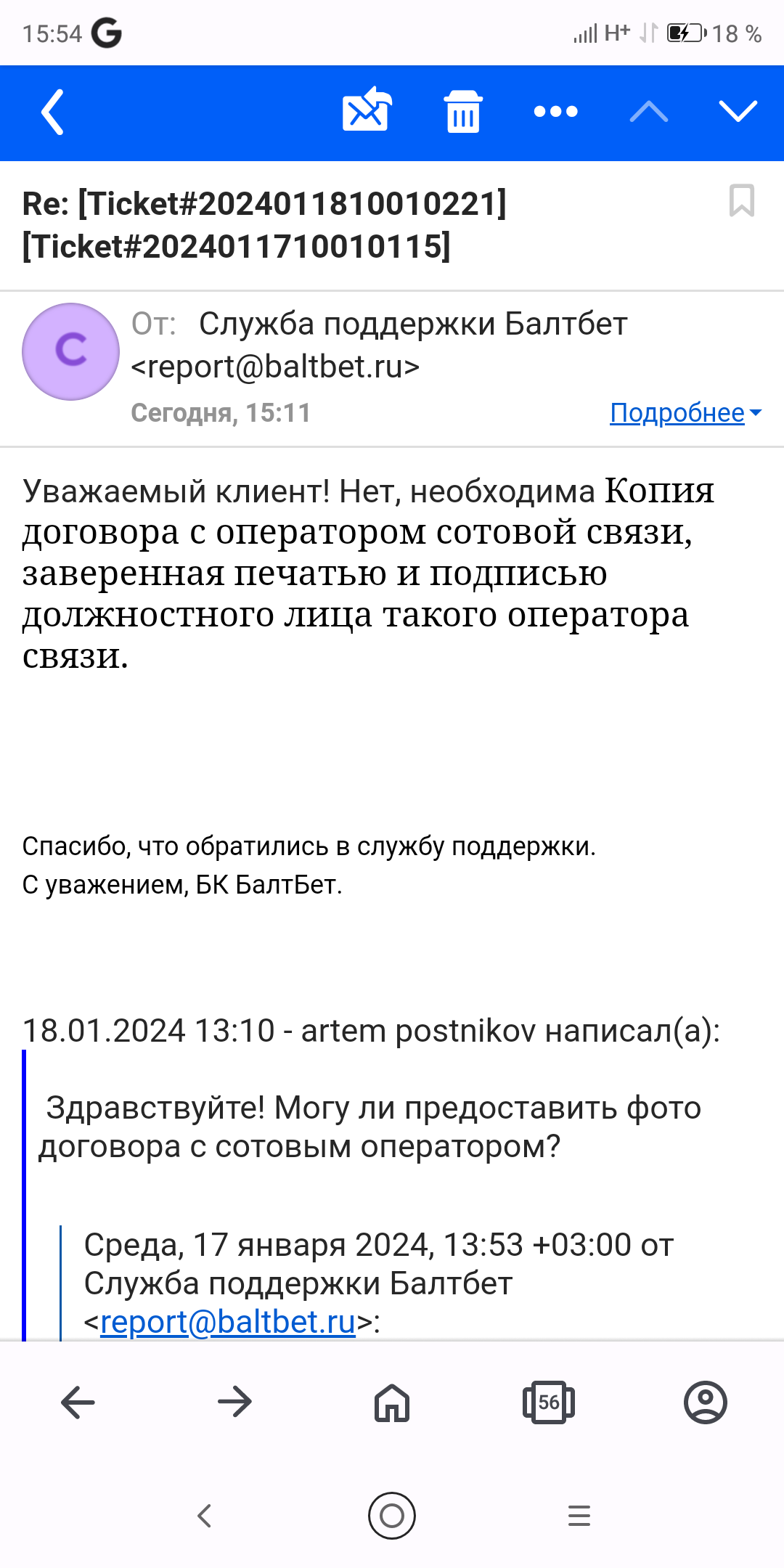Здравствуйте уважаемые сотрудники Легалбет! У меня возникла непонятная ситуация с бк Балтбет. Играл с начала февраля 2023г. В начале октября был порезан лимит до 1 руб. Начал выводить деньги со счета небольшими суммами , вывел 90 тысяч , на счету должно остаться примерно 71700руб. аккаунт был заблокирован, прошел видео верификацию, пришло письмо с отказом в выплате и необходимости посетить ппс для получения уведомления о начале процедуры верификации и доп. мер по идентификации клиента. посетил ппс, подписал уведомление, оно было зарегистрировано оператором. В ппс сказали ждать сообщения, когда нужно будет посетить их еще раз. Никакого сообщения не приходило, в этот же день вечером обратился в сл. поддержки, ответили ожидают получения оригинала уведомления. Такой же ответ получаю и сейчас. Пожалуйста, помогите разобраться этой ситуации!
