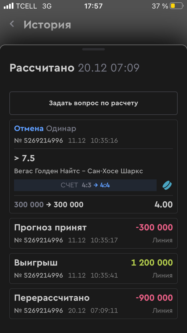 Здравствуйте, 20 декабря делал ставки на тоталы в НХЛ, в этот день проиграл кучу денег. В отчаянии поставил на тотал больше 4,5 во втором периоде Баффало-Коламбус, 175000 рублей с коэффициентом , буквально через секунду ставка зашла, мне начислили выигрыш в размере 997500 рублей. Спустя некоторое время я заметил что мой баланс уменьшился на 822500 рублей, спустя ещё 20 минут ещё на 900000 рублей. Мне отменили выигрышную ставку от сославшись на п.п. 3.7 и 4.5.1
