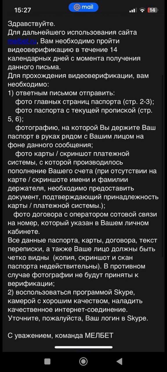 Короче Мел Бет не допускает меня до видео верификации, типа время (14) дней истекло. Пользовался многими бк, Мел Бет оказался самой неадекватной бк( особенно в плане верификации). Никому не рекомендую эту БК.