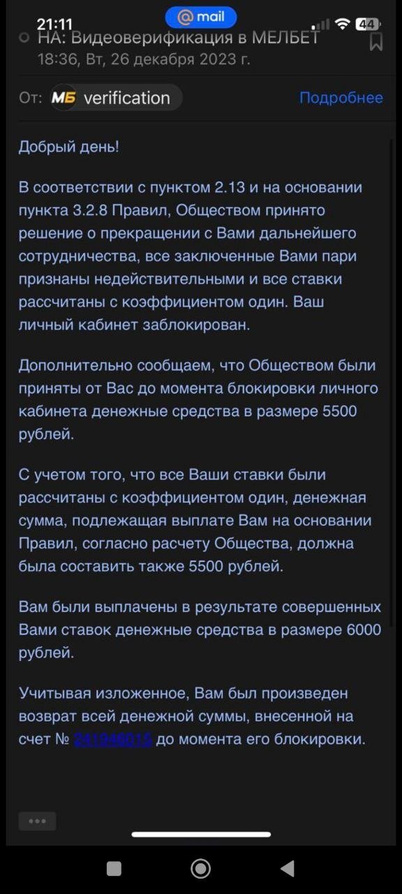 Заблокировали аккаунт в октябре после того. как поймал хороший коэффициент 15+. В ходе повторной верификации были предоставлены все необходимые документы. Сегодня получил ответ, сотрудничество прекращено все пари рассчитаны по коэффициенту 1…ссылаясь на пункт правил 3.2.8…ни одного пункта правил я не нарушал, а пункт правил 3.2.8 сделан чтобы кидать игроков которые выходят в плюс, объяснять причину блокировки конечно никто не будет, так как ее просто нет и быть не может