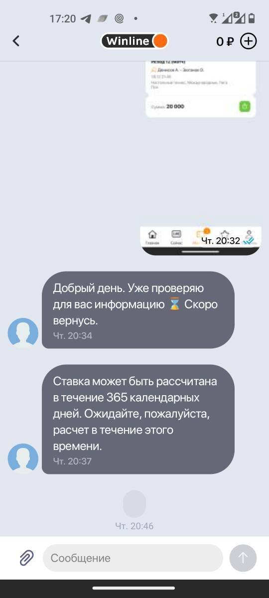 По информации от букмекера, ставка будет рассчитана в течение 365 дней согласно п.п. 1.10.6. Длительная задержка расчета ставки букмекером не аргументирована.