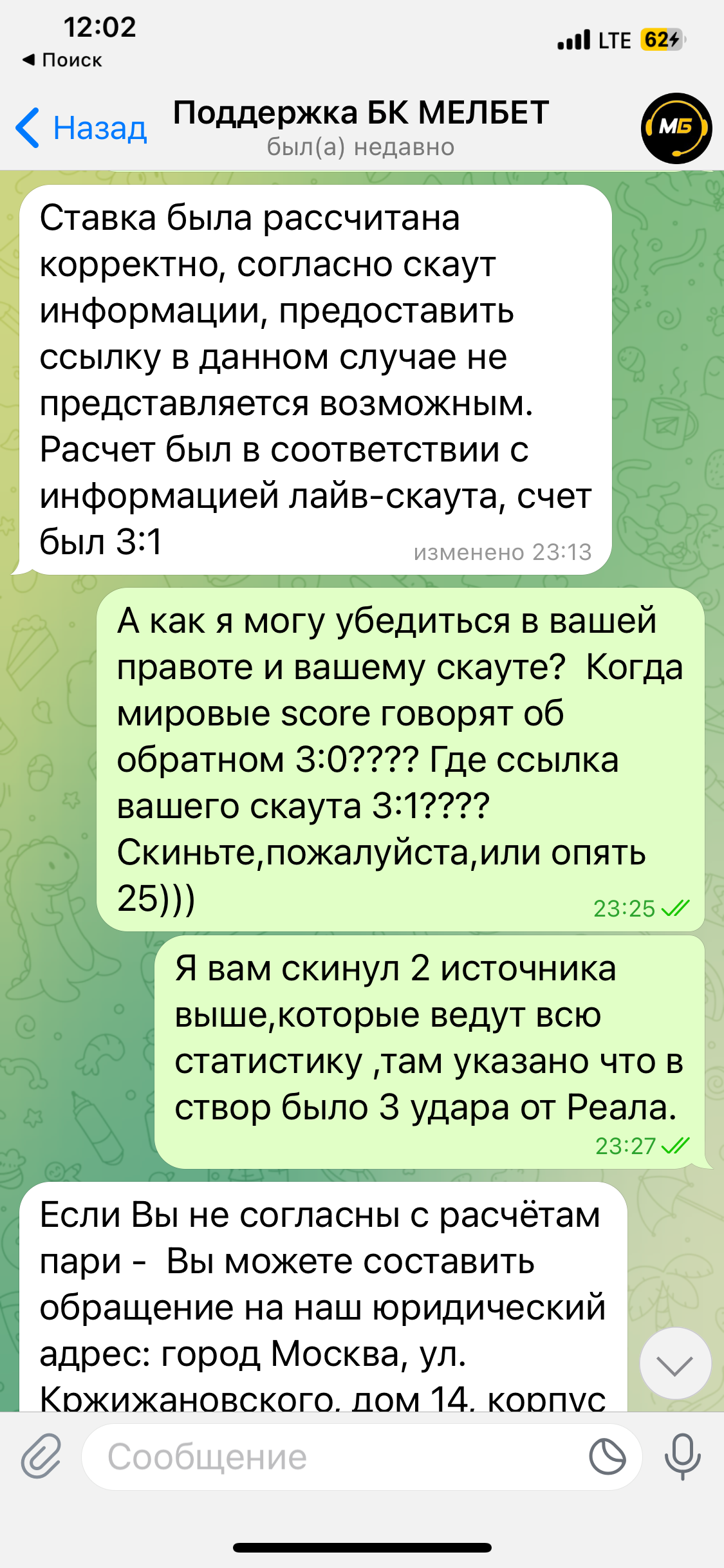 Добрый день. Я вам ответил на почту. Ну если бы на тот момент было бы всего 2 ударо,то я бы поставил на Тотал Усв меньше 3.5. Но букмейкер сам предложил данные котировки ,чем я и воспользовался . Я писал им в поддержку ,что было всего 3 усв,но их скаут разглядел в 1 тайме 4,поэтому возврат ставки был,а на утро сами же пересчитали на 3 усв,но выигрыш так и не зачислили. Это не моя вина,в том что букмейкер не правильно посчитал усв,мне предложили -я поставил,поэтому считаю что выиграл.