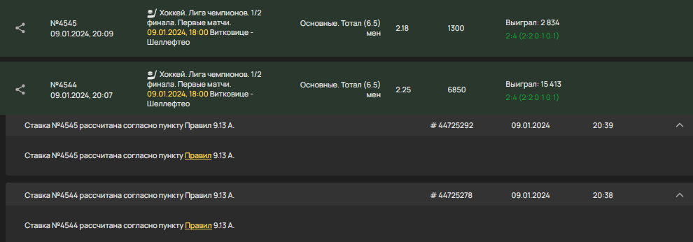 Добрый вечер. Мой логин в БК ОЛИМП 4482346. Смотрел хоккей, крупнейший турнир Европы, полуфинал Лиги Чемпионов, решил сделать несколько ставок, все оказались выигрышные, однако букмекер применил к моим ставкам мошеннические пункты правил, которые позволяют БК Олимп уменьшить коэффициент в абсолютно любой выигрышной ставке любого игрока. Ставка 4544, приняли по кф , но рассчитали по , украли с моего выигрыша 5753.5 рубля. ставка 4545, приняли пари по кф , рассчитали по , украдено БК Олимп 702 рубля. В Сумме БК Олимп мошенническим образом списала 6455 рублей. БК Олимп утверждает, что мои пари создавали какую-то арбитражную ситуацию. Я понятия не имею что это такое, я просто совершил ставку когда смотрел хоккейный полуфинал Лиги Чемпионов. Котировки, предлагаемые БК Олимп были нормальными, в других БК котировки были схожими, а например в самой надёжной и известной БК Bet365, котировки были даже выше, чем в БК Олимп.Я не согласен с применёнными правилами в отношении моих ставок #4544 и #4545. Данные правила из пункта правил могут быть использованы букмекерской конторой Олимп в отношении абсолютно любой ставки. И только в этих рамках правил БК Олимп, которые БК Олимп же и утвердила, БК Олимп можете быть права в трактовках этих правил, в рамках законов РФ над БК Олимп просто посмеются в любом суде. БК Олимп не имеет права злоупотреблять этими правилами и списывать выигрыш мошенническим образом, как это сделала БК Олимп в отношении пари #4544 и #4545. БК Олимп злоупотребляет данным правилом, так как не предоставляет доказательства (так как у БК Олимп их нет) в том, что ставки действительно создавали, какую-то там придуманную этой же БК Олимп, арбитражную ситуацию, да и вообще, что такое "арбитражная ситуация" для законодательства РФ? В законах Российской Федерации ничего не сказано о придуманных БК ОЛИМП "арбитражных ситуациях" на основании которых БК Олимп имеет право удерживать и списывать/уменьшать выигрыши в свою пользу, ведь так? Я думаю, что над БК Олимп посмеются в суде и БК Олимп придётся выплатить не только выигрыш, который в БК Олимп списали, а так же оплатить все издержки, которые будут потрачены мной на данное дело. БК Олимп действительно хочет всего этого? Или всё-таки БК Олимп пересмотрит свои решения по данным ставкам?