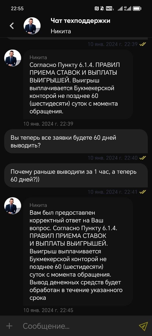 Здравствуйте, я старый клиент данной БК, проиграл более миллиона , никогда никаких проблем с выводом не испытывал , но 20 декабря 2023 контора просто перестала выводить средства в течении нескольких часов , как было ранее. При этом контора не запрашивала никаких документов , не порезала лимиты , т.е дает совершать ставки , но все заявки на вывод теперь якобы будут одобрены через 60 дней по какому-то новому правилу . Я считаю , что это полный абсурд , я не плюсовой игрок , ставил обычные ставки и прошу пожалуйста вывести средства , уже прошло 3 недели с момента подачи заявок на вывод