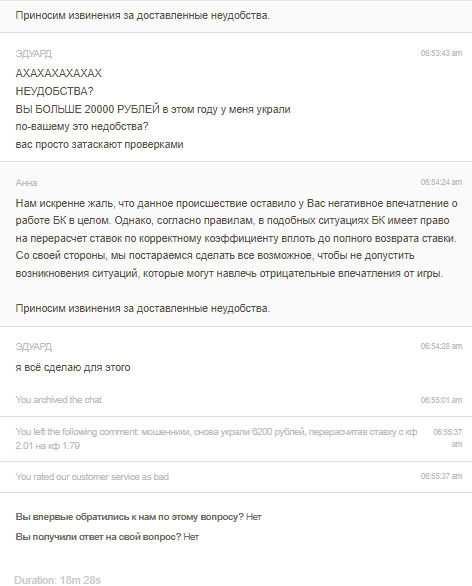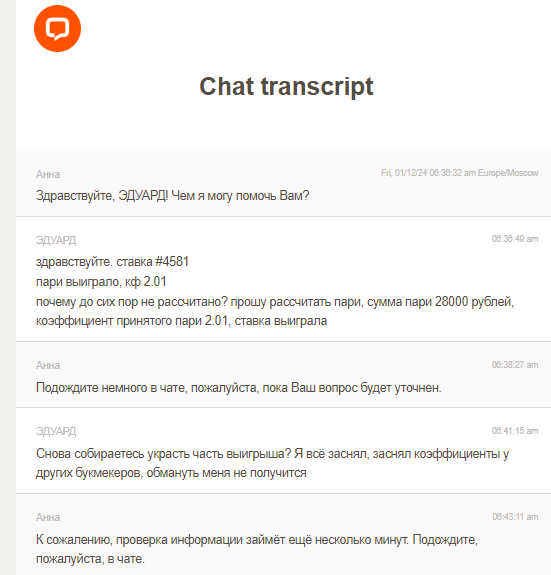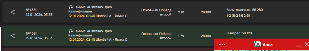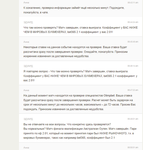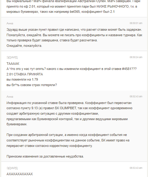Ничего нового. БК Олимп продолжает обворовывать меня. Уже более рублей присвоили себе прикрываясь тем, что якобы мои выигрышные ставки содержат не рыночные коэффициенты и уменьшают коэффициенты на моих выигрышных ставках. На этот раз матч финала квалификации Австралиан Оупен 2024. иорданец Шелбай - австралиец Ясика, ставил п2 на сумму 28000 рублей сразу после окончания 2го сета, коэффициент принятия ставки составляет , что на тот момент являлось НИЖЕ РЫНОЧНЫХ КОЭФФИЦИЕНТОВ, так как в самой надёжной букмекерской конторе bet365, коэффициент был 2.1, а например в бетбум был , я специально зашёл на их сайт посмотреть их котировки. Ставка выиграла, но рассчёта по кф я не дождался, букмекер изменил кф на и украл с моего счёта 6160 рублей. Служба поддержки талдычит одно и то же про то, что моё пари содержало ошибку в котировке... Ничего нового, прилагаю скриншоты ставок и скриншоты переписки с поддержкой БК Олимп. Прошу все скриншоты оставить в жалобе чтобы все видели беспредел со стороны БК ОЛИМП.