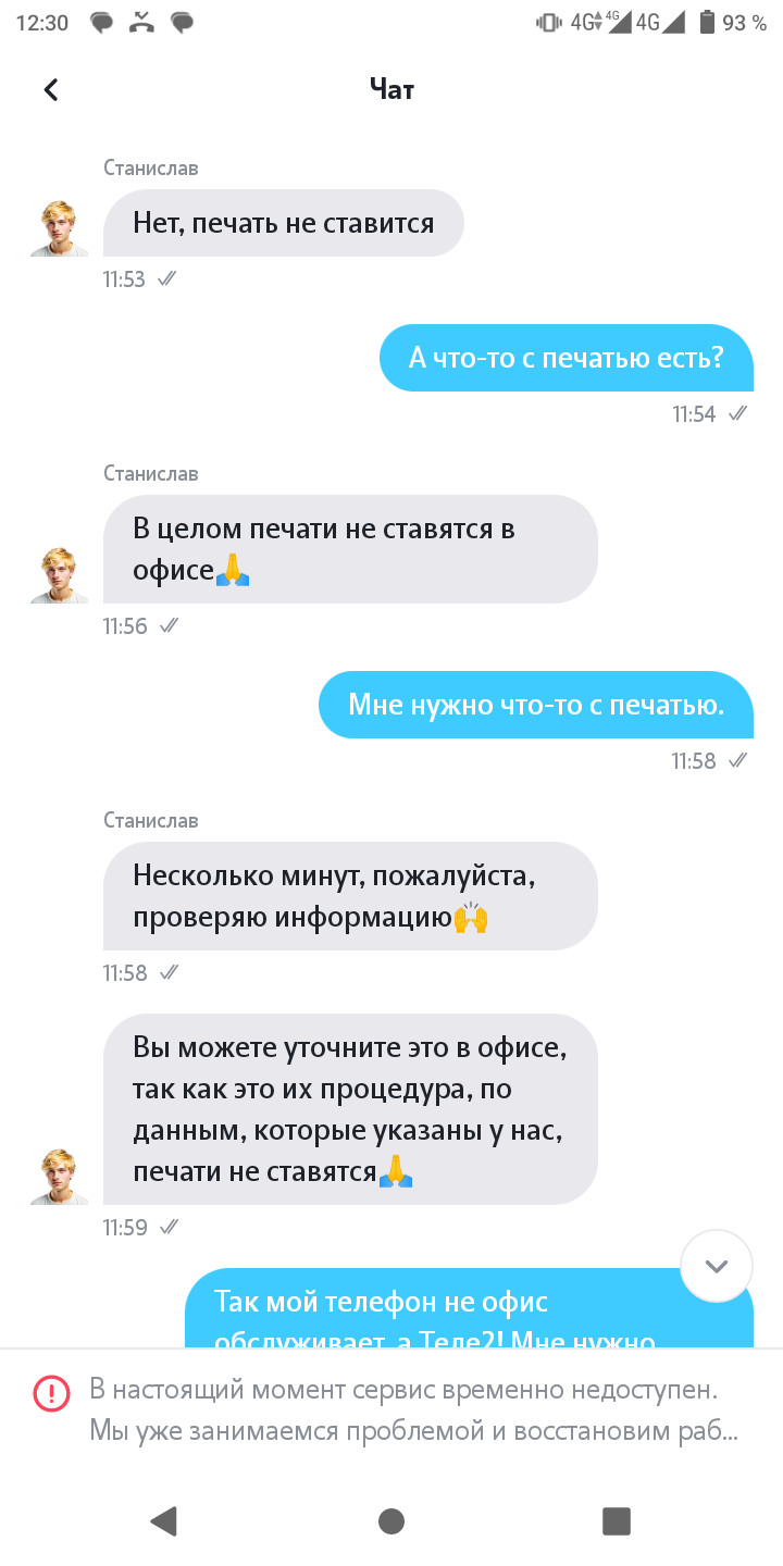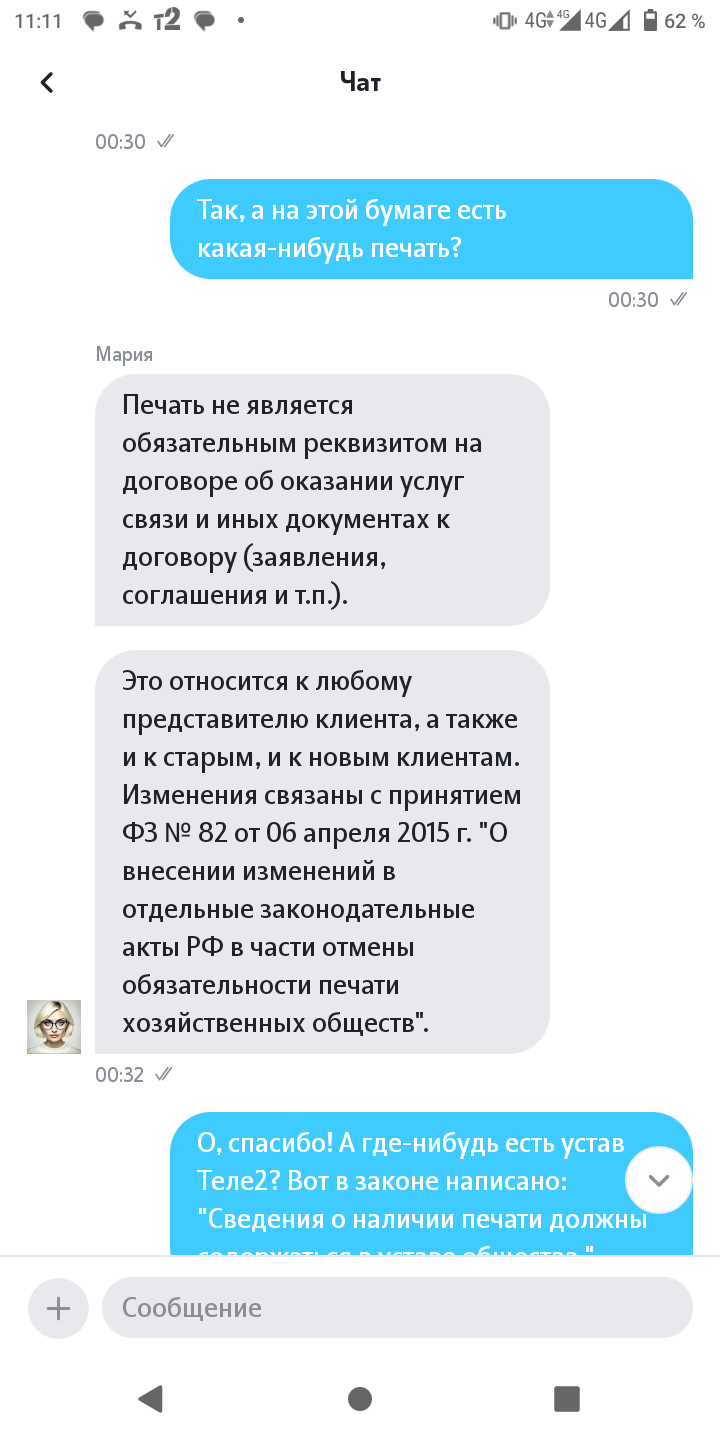 Проблема с договором с сотовым оператором: Бетбум требует бумагу с печатью, но Теле2 не ставит печати! "Печать не является обязательным реквизитом на договоре об оказании услуг связи и иных документах к договору (заявления, соглашения и т.п.). Это относится к любому представителю клиента, а также и к старым, и к новым клиентам.Изменения связаны с принятием ФЗ № 82 от 06 апреля 2015 г. "О внесении изменений в отдельные законодательные акты РФ в части отмены обязательности печати хозяйственных обществ". Вот так мне написали в Теле2. И что мне теперь делать? Отправил договор с Теле2, печати там нет. А Бетбум просит с печатью. Считаю это несправедливым: договор на мое имя, есть личный кабинет Теле2, там все данные указаны, детализация и т.д. Но печать они не ставят в своих точках! Ни на чем!