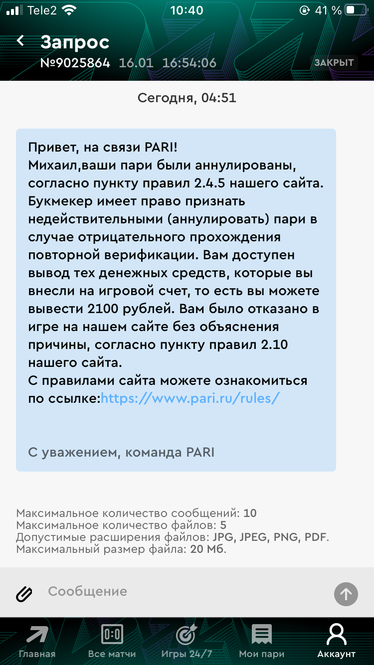 Арбитраж Легалбет получил комментарии и разъяснения от букмекера. Счет закрыт, а выигрыш аннулирован по решению СБ за нарушение правил – мультиаккаунт. Действия БК в рамках правил.