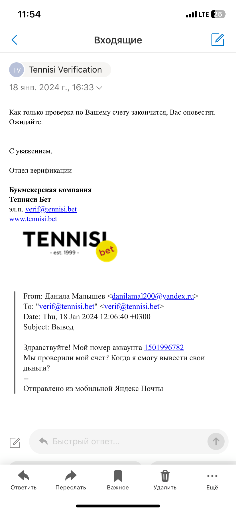 Здравствуйте! Поставил на футбол ₽, выиграл ₽. Запросили верификацию. Все отправил: видео, чеки, выписки. Пишу им сколько будет длиться верификация, какие сроки?! Морозятся и отписываются, что у каждого сроки индивидуальные, но так и годами можно рассматривать. Не хотят видимо отдавать выигрыш