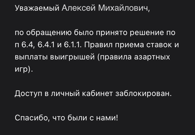 Арбитраж Легалбет получил комментарии и разъяснения от букмекера. Счет закрыт, а выигрыш аннулирован по решению СБ за нарушение правил БК. Открытому разглашению подробности нарушений не подлежат. Действия БК в рамках правил.
