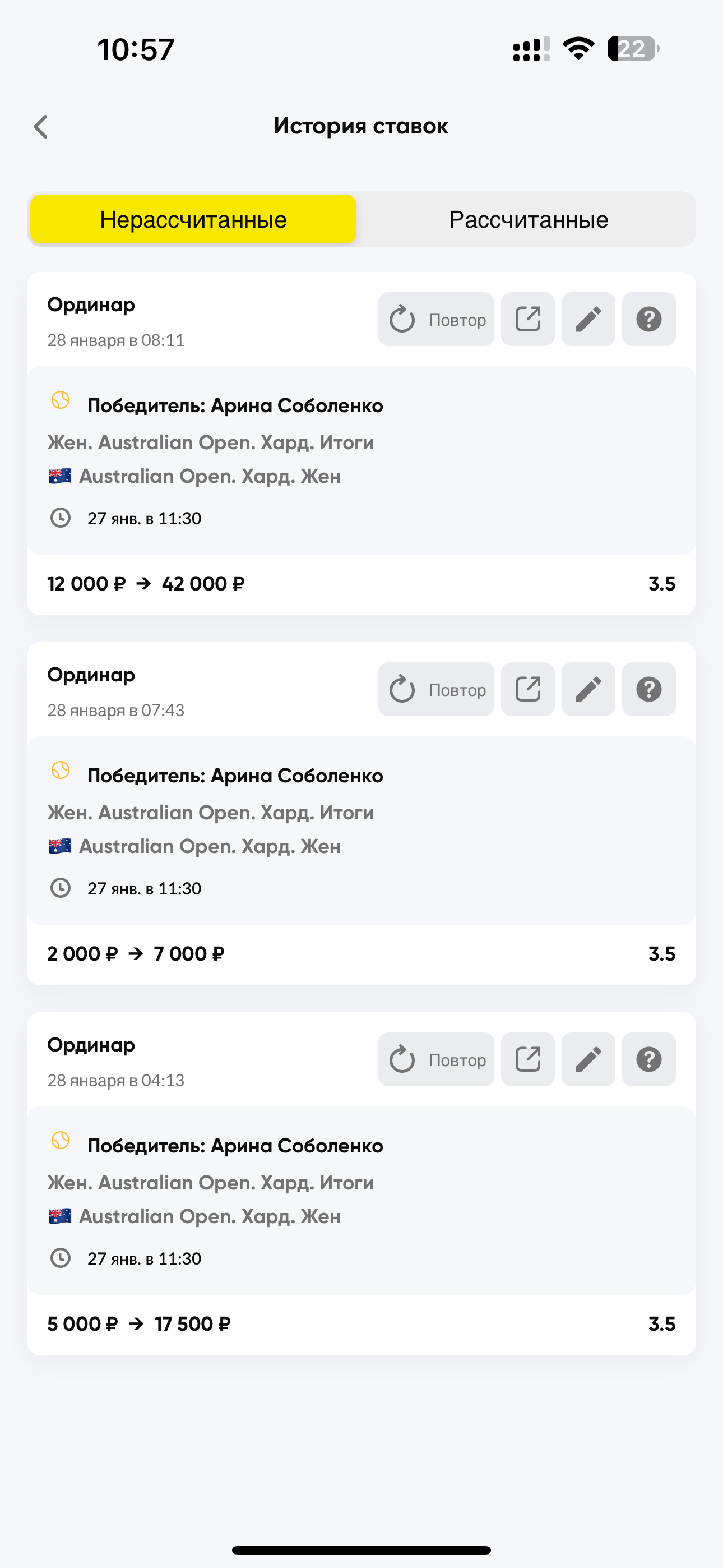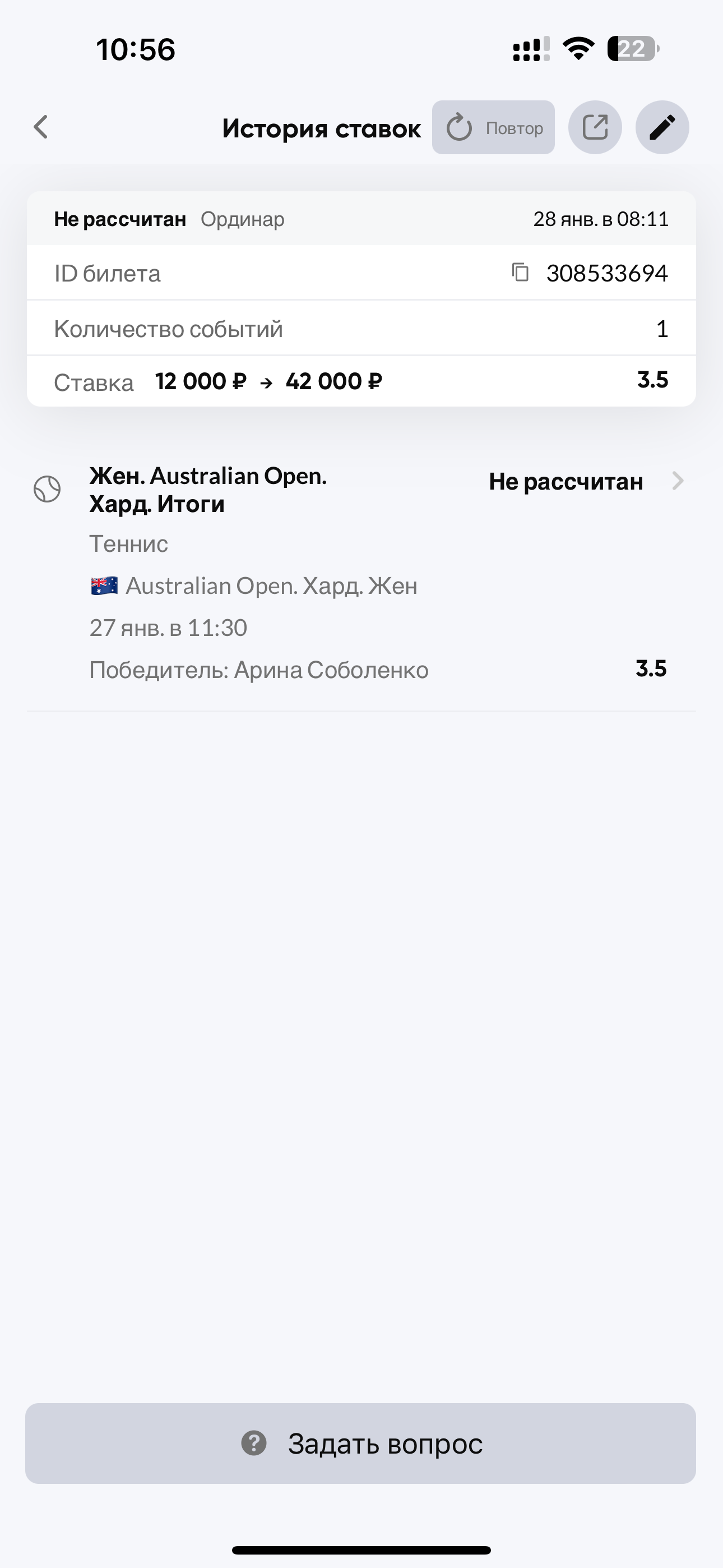 28 января в 07:43 я совершил 3 ставки вида итоги на Жен. Australian Open. Я слышал от знакомых, что в финале будет играть Арина Соболенко с кем-то и мне все уверяли, что она финал выиграет. Какого числа состоится игра я не знал. Я это вспомнил и зашёл в линию нашёл только такой вид ставки и решил поставить на Арину за коэффициент. Оказалось, что матч уже был разыгран и сама линия от Букмекера являлась ошибкой. Вечером я обратился в БК, чтобы узнать что будет с моей ставкой, я уже понимал, что там будет возврат потому что тут явная ошибка БК. Какого было моё удивление, когда я услышал ответ оператора: Вы совершили ставку на победителя АО 2025. Ждите расчёта ставки. Что за бред? Давайте по-порядку. Самое первое и ужасное, что БК решила не признать свою ошибку, а "выкрутиться" и заморозить !на год чужие деньги. Чисто логически: 1.) Как БК может выдавать коэффициента за год до события, а уж тем более список участников? Если БК даже не предпологает как будет выглядеть сетка турнира, чтобы высчитать коэффициенты правильно. 2.) Когда ставка совершалась был указан 2024 год, сейчас уже 2025. В купоне ставки была дата 2024, теперь 2025. Вот только интернет всё помнит и у меня есть скриншоты со старыми цифрами. 3.) После недолгого разговора мне задают вопрос - Вы хотите возврат средств за данные ставки? Я отвечаю - Да, я согласен. Ответ убил: Какая-то другая служба рассмотрит ваше обращение и по результатам будет обратная связь. Когда рассмотрит, что за служба, никакой конкретики просто вода, чтобы замести следы своей ошибки. Я просто хочу, чтобы БК сделала вовзрат средств и я готов закрыть глаза на такое отношение к клиенту.