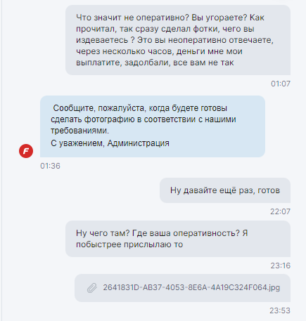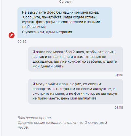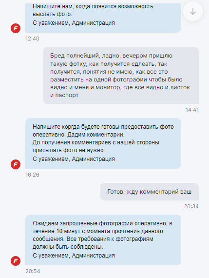 Здравствуйте, сложилась такая ситуация, выиграл в этой букмекерской конторе 83 тыс. рублей, после чего мне не дают вывести мой выигрыш уже две недели мучаюсь, запрашивали фотографии для верификации, какие только не запрашивали, и с листком с датой и с перепиской на компьютере, все прислал, хотя думал , что только паспорт достаточно прислать, чтобы меня идентифицировать, ну я все прислал, дальше попросили подождать 7 дней, тоже не понятно зачем, и потом все по новой , только еще ограничили мне время в течении 15 минут прислать, прислал им все заново в течнии 15 минут, а что в итоге? они опять запросили фотку: вот как есть пишу: селфи с компьютером, с моим лицом, с бумагой с датой и с паспортом, и чтобы все это не перекрывало монитор и все было можно прочтитать, хотя видели, что у меня даже не ноутбук, а стационарный компьютер и это все сделать физически не возможно, но я понял, что мне тупо не хотят платить, так как я прислал все фотки, тем самым себя идентифицировал, пожалуйста помогите разобраться с ситуацией, если нужны будут скриншоты переписки, я все пришлю
