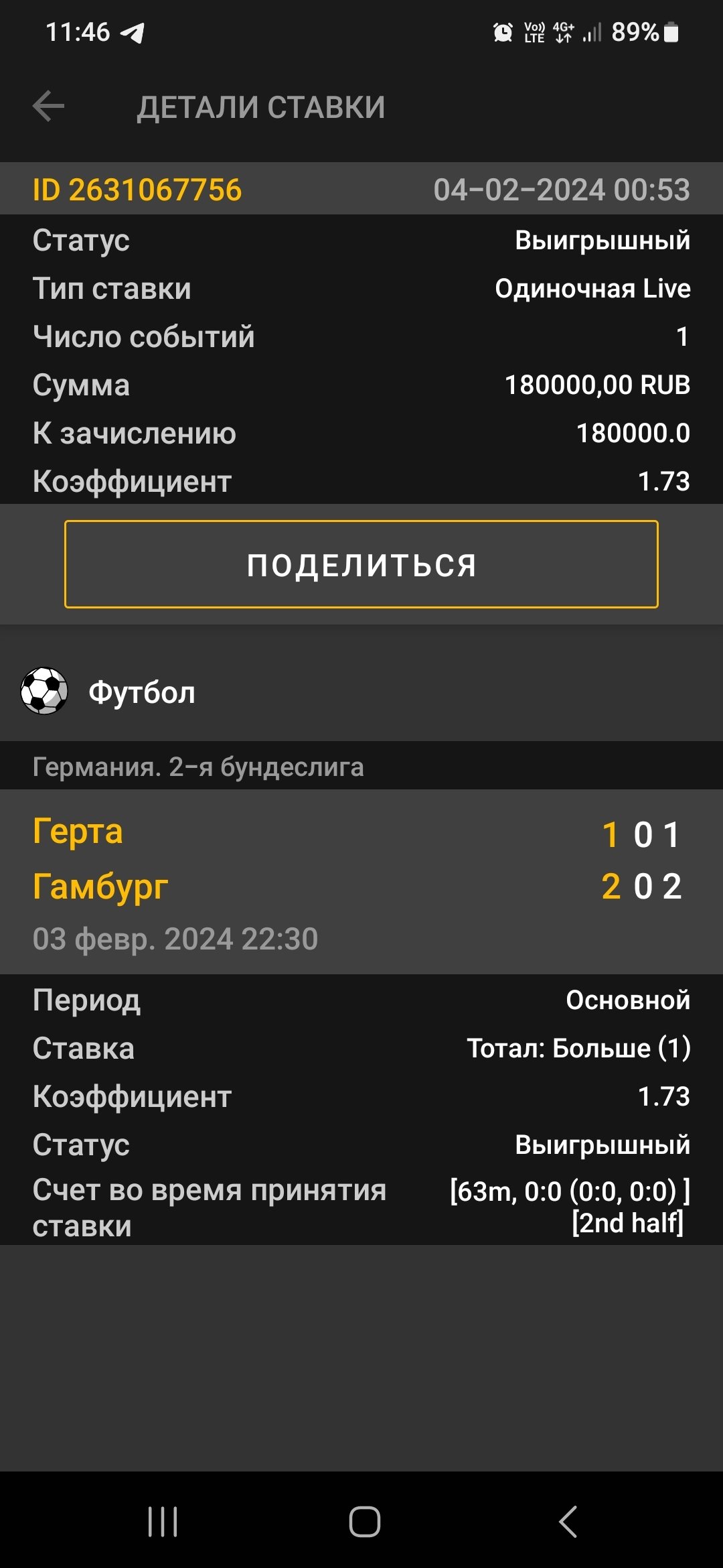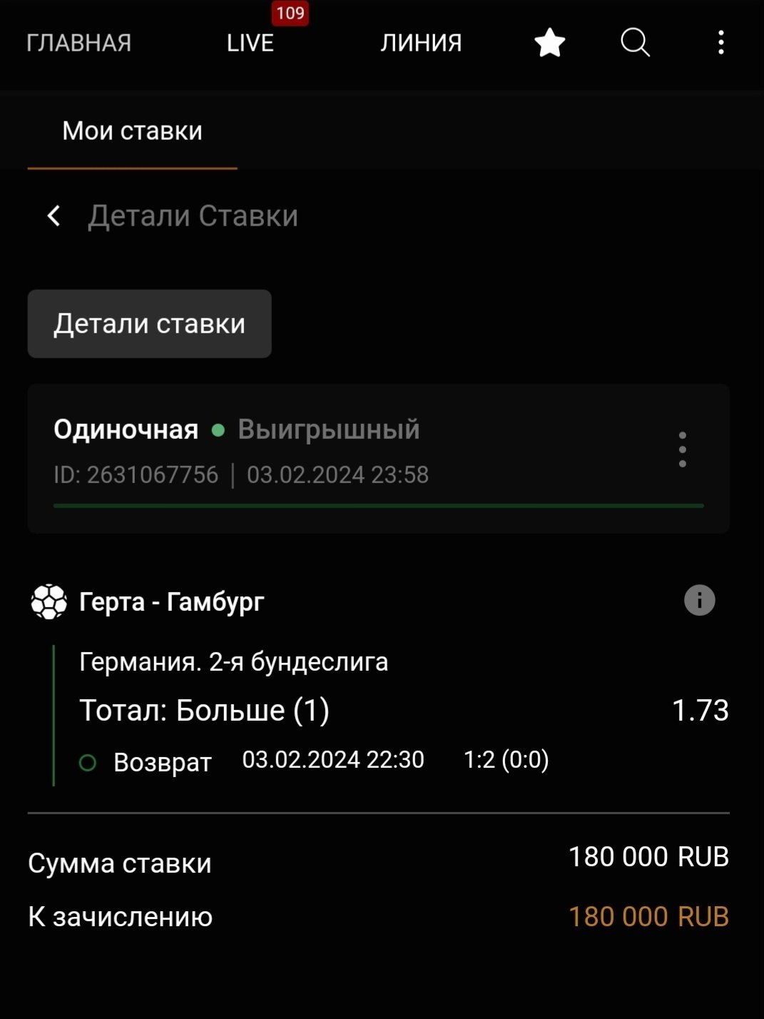 3 февраля 2024 года сделал ставку ТБ1 в размере 180000 на матч 2ой Бундеслиги Герта-Гамбург. Матч прерывался из-за поведения фанатов, однако был продолжен. Ставка сыграла, но букмекер Мелбет рассчитал как возврат. При этом другую мою ставку на этот матч ТБ2 букмекер рассчитал без отсылки к паузе в матче и выплатил деньги. Хотелось бы получить законную выплату.