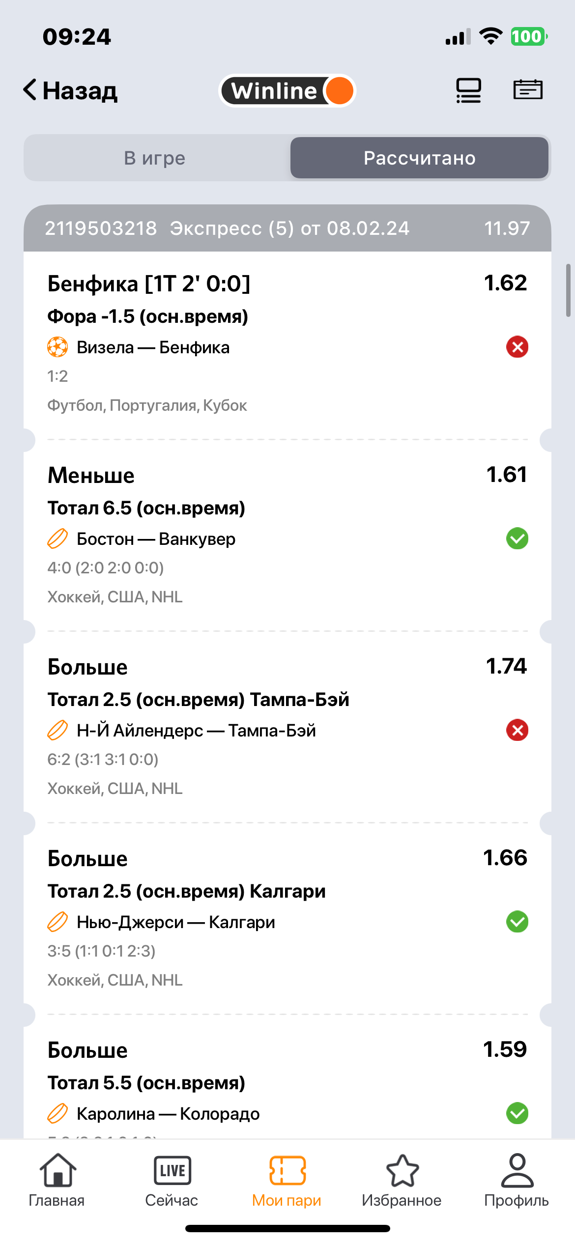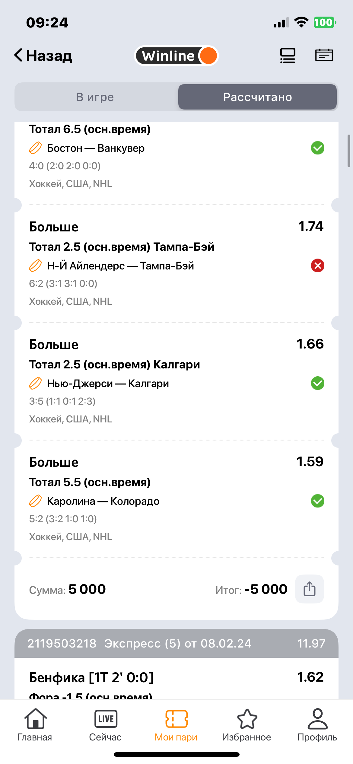 Ставил экспресс на сумму 5000 рублей. Зависло приложение винлайн, в связи с чем поставилось 5 экспрессов по 5000 рублей вместо одного