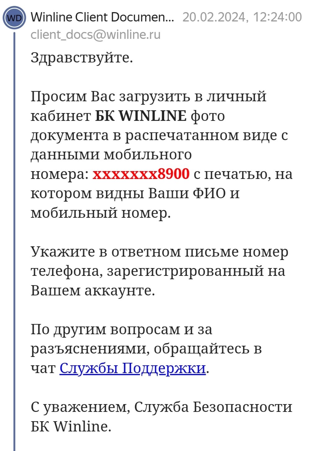 Здравствуйте. Если так и не получилось подгрузить документ, то можете его отправить на почту client_docs@winline.ru. В письме нужно указать номер телефона, привязанный к аккаунту.