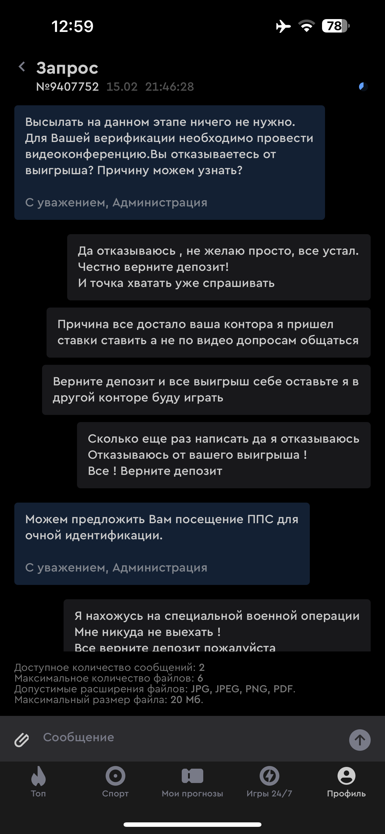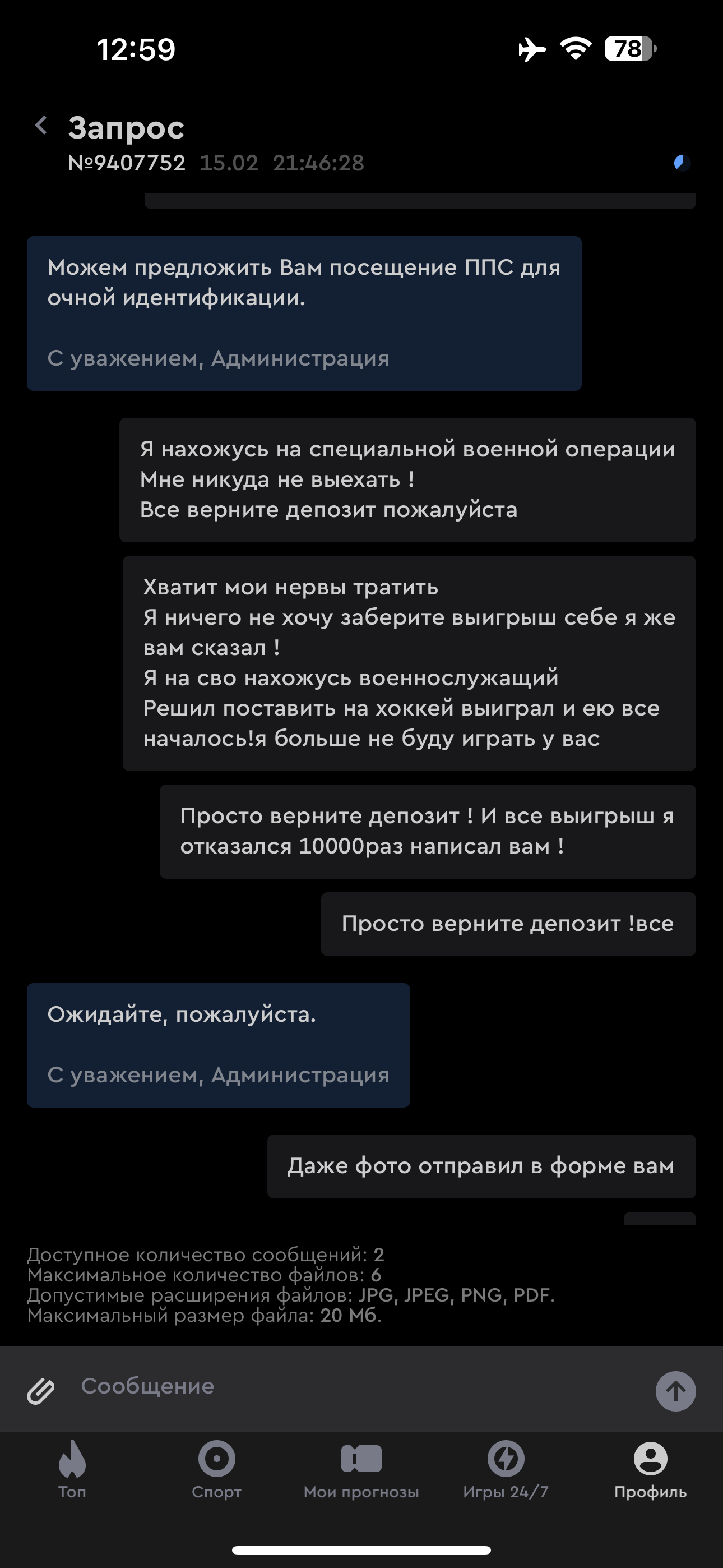 Ответьте тогда мне пожалуйста! ПОЧЕМУ МНЕ ОНИ НЕ ДАЮТ ПРОЙТИ ОЧНУЮ ВЕРИФИКАЦИЮ В ППС В СВОЕМ ГОРОДЕ И НЕ ВЫПЛАЧИВАЮТ ВЫИГРЫШ? Человек находится на СВО они намеренно просят пройти идентификацию в ППС зная что он не сможет туда явиться, а я сам настаиваю с 8 января на том чтобы явиться в ППС а они не соглашают, ВСЁ ДЕЛАЮТ ДЛЯ ТОГО ЧТОБЫ КЛИЕНТАМ НЕ ВЫПЛАЧИВАТЬ ДЕНЬГИ! Самая мерзкая БК в которой когда я либо играл!