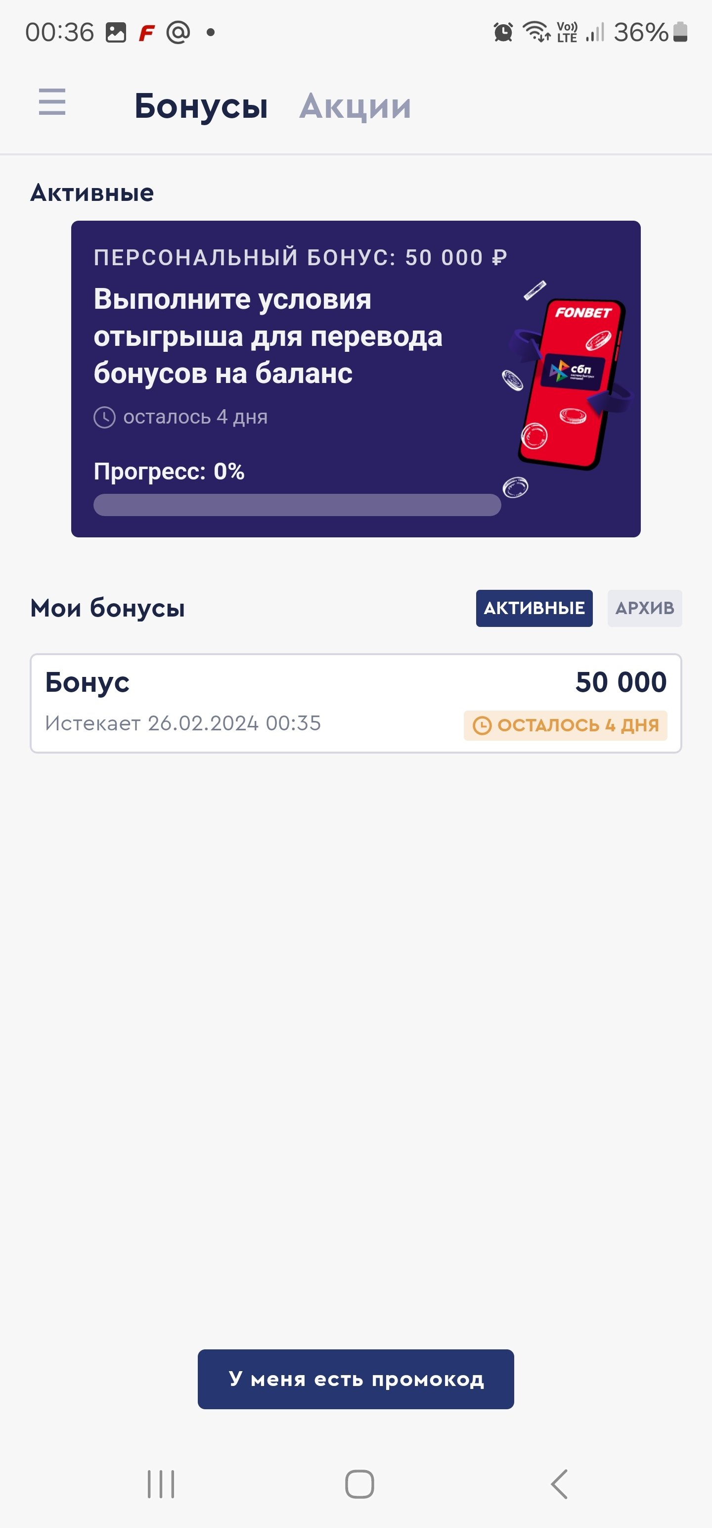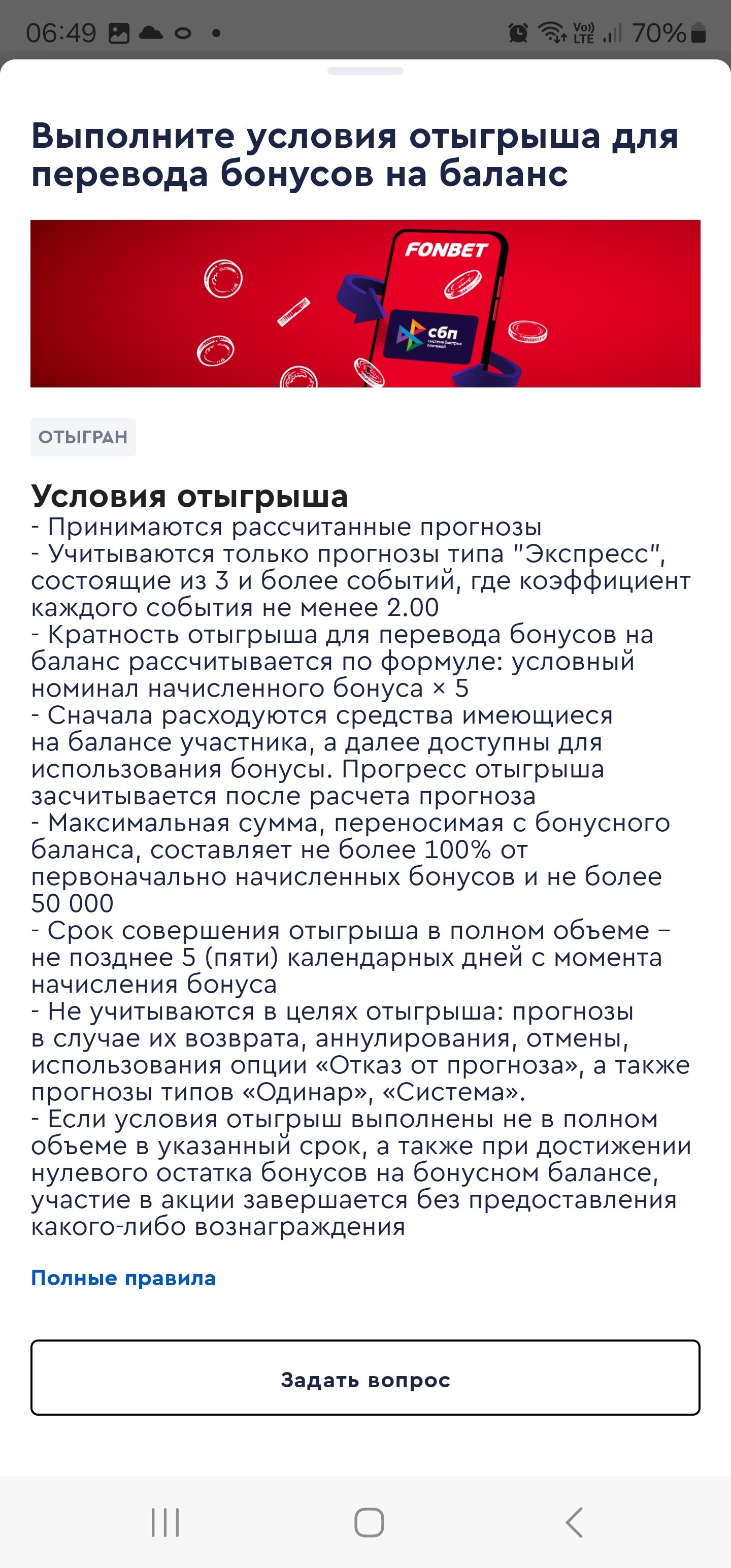 21 февраля 2024 года, в среду, приняла участие в акции по промокоду SBP. Мой ID клиента на фонбете 36778916. Ввела промокод SBP, по СБП закинула 50 тысяч рублей, по акции мне дали 50 тысяч на бонусный баланс. По условиям акции, чтобы эти 50 тысяч перешли на основной баланс, надо было сделать ставок на общую сумму в 5 раз превышающую сумму депозита. Поэтому я закинула на аккаунт еще денег и сделала ставок на сумму 251 тысяч рублей (точнее 251190 рублей). Все ставки были сделаны на экспрессы из трех событий и кэфами от 2 и выше каждое событие в каждом экспрессе, т.е. ставки полностью соответствовали условиям акции. Бонусный баланс я даже не трогала, ждала когда все ставки сыграют и бонусный баланс перейдёт на основной баланс. Но вот после того как все ставки были рассчитаны 22 февраля 2024, мне до сих пор спустя день бонусный баланс не перешел на основной, хотя я выполнила свою часть акции полностью в соответствии с правилами акции, ничего не нарушила. Сделала запрос по этому поводу, в ответ получила сообщение, что мне отказано без объяснения причин в использовании сервисов согласно п.п.3,5. Мне отказали в переносе бонусных 50 тысяч на основной баланс уже после того как все ставки, удовлетворяющие акции, были рассчитаны. БК обязана выполнить свою часть акции, дать мне завершить акцию, получить бонусный баланс на основной баланс за то что я сделала ставок на сумму в 5 раз превышающую сумму бонусного баланса. А если уж и отказывают в переводе бонусов на основной баланс согласно условиям акции без причин, тогда и ставки должны аннулировать. В итоге бонусный баланс мне не доступен и часть депозита потеряна.В этой акции я участвую второй раз. В прошлый раз делала всё так же, ничего не нарушала, только сумма депозита у меня была меньше в разы. Тогда мне по акции с бонусного баланса деньги перевели на основной баланс без всяких вопросов. А в этот раз такая неприятность. Есть скриншоты того что ставки сделаны по правилам, есть скриншот того что бонусный баланс отыгран, могу видео записать с личного кабинета, всё показать. Прошу вас разобраться в этом вопросе, может я тут не права, но я считаю, что со мной поступили не справедливо или ошибочно.