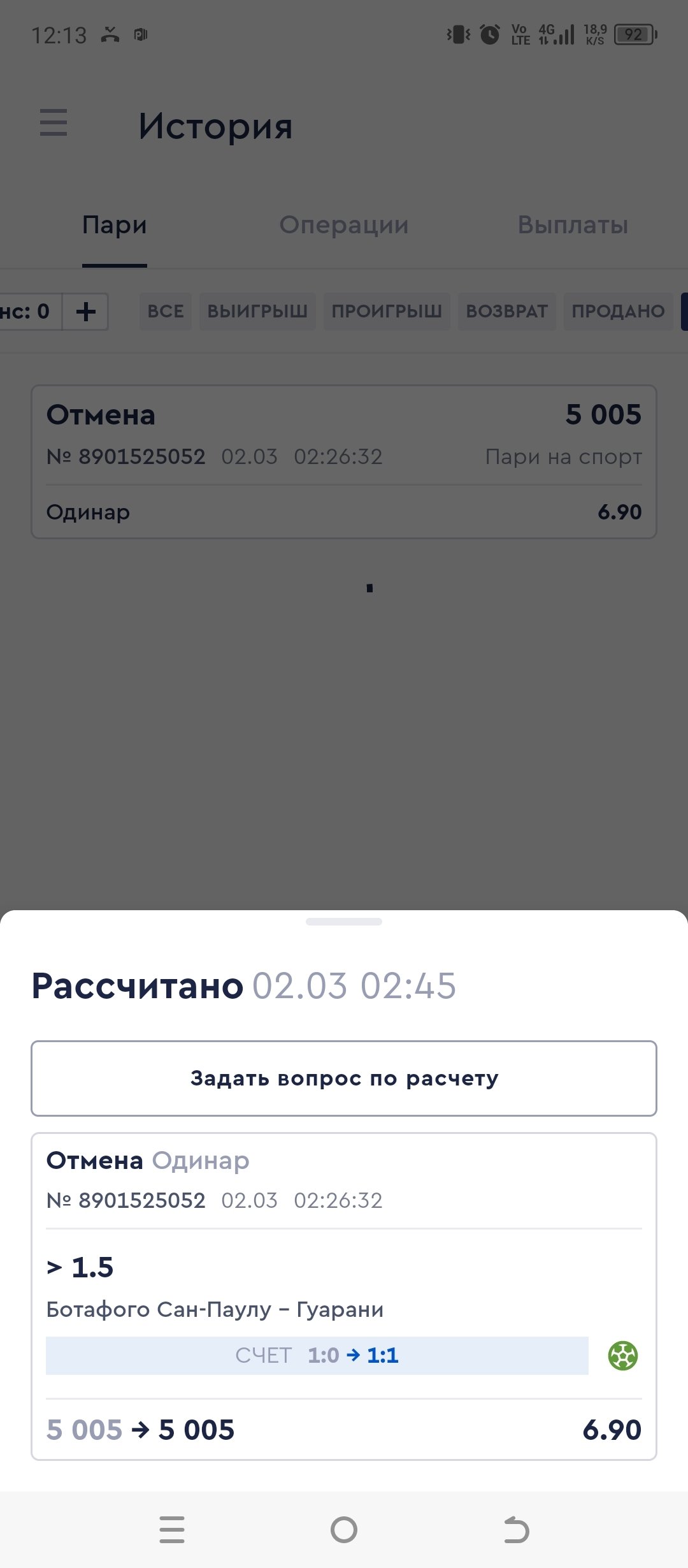 Здравствуйте, сделал сегодня ночью ставку на матч чемпионата Бразилии Ботафого - Гуарани , в дополнительное время на тотал больше 1,5 давали коэффициент 6 с чем-то. На этот матч также уже стояла ставка на тм 2,5 , в итоге счет 1:1. Событие рассчитали, а через 10 мин сделали возврат ссылаясь на неправильный коэффициент, техническую ошибку и тд, ставка была при счёте 1:0 , коэффициент вполне нормальный. Не реагируют, пихают правила. Просьба посодействовать, это беспредел!Номер купона 8901525052. I'd клиента 8469101