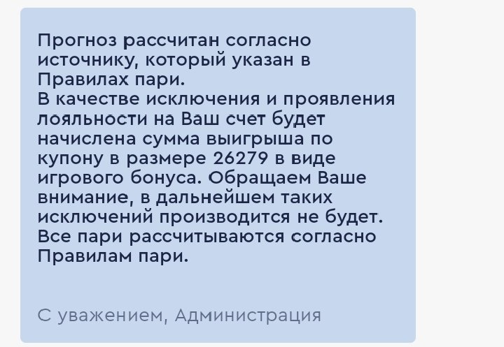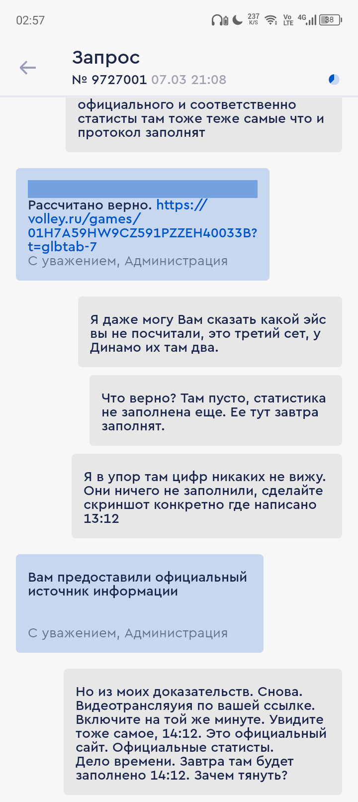 Здравствуйте. Буду благодарен помощи. При расчёте купона, я считаю, допущена вопиющая ошибка, а служба поддержки трактует одну и туже ситуацию по разному и вообще не хочет как-то по человечески решать вопрос.Обо всем по порядку:Матч Динамо-Югра, ставка на эйсы фора (-1,5) на команду Динамо. Букмекер рассчитывает со счетом 13:12, якобы пройгрышь (скриншот прилагаю).Я создаю запрос, в котором указываю на явную ошибку, где меня отправляют на официальный сайт с комментарием "Рассчитано верно". (Скриншот прилагаю) Я захожу туда и ничего не понимаю, там нет статистики, возмущенно продолжаю диалог как так можно, делать вывод без статистики, потом дальше в ходе переписки они отсылают оказывается меня на видеотрансляцию, прошу запомнить этот момент, он очень важен (скриншот прилагаю).Через некоторое время появляется официальный протокол где счёт 14:12 (скриншот прилагаю) ну вроде бы все, подумал я, по слову чести сейчас скину им, рассчитают и я получу выйгрышь, но ни тут то было. С этого момента вступает в силу пункт правил 10.9 бк Фонбет, который кратко гласит о том, что они могут основываться на видеотрансляции для рассчета купона (это как раз про момент который ранее я просил запомнить, что отсылали они меня оказывается не на видео, а на статистику). И далее следует комментарий от них, что согласно правилам, когда команда делает три касания эйсом это не считается (скрин прилагаю) ,отрицать не буду, такое было, в третьем Сете такой эйс команде Динамо засчитали. Раз есть такое правило, хорошо, я согласился, получается на данный момент мы вычитаем один эйс из копилки Динамо и имеем счет 13:12. Но это только пока. Я также, согласно пункту правил 10.9, по которому рассчитывают мое пари, не уклоняясь от него следую в первый сет. А именно на 27:40 по времени и 21 очко первого сета команды Югры. (Ссылка:). По этой же ссылке к слову говоря можно посмотреть официальный протокол, где счёт 14:12. Ну да ладно. Смотрим 27:40 видеотрансляцию (21 очко Югры) и видим что в этом моменте команда Динамо делает ТРИ КАСАНИЯ, пункт правил 10.9 говорит что это не эйс, а вот бк Фонбет засчитал как эйс. На лицо двойные стандарты, трактовка одного и того же эпизода по разному.По пункту 10.9 верный счет получается 13:11, а по официальной статистике 14:12, ну как не посмотри на ситуацию, со всех сторон правда на моей стороне. Если представители бк читают, я заявляю серьезно, я пойду в прокуратуру, если мой вопрос не решится положительно для меня, вы в переписке закопали сами себя.Спасибо за внимание, надеюсь на помощь.