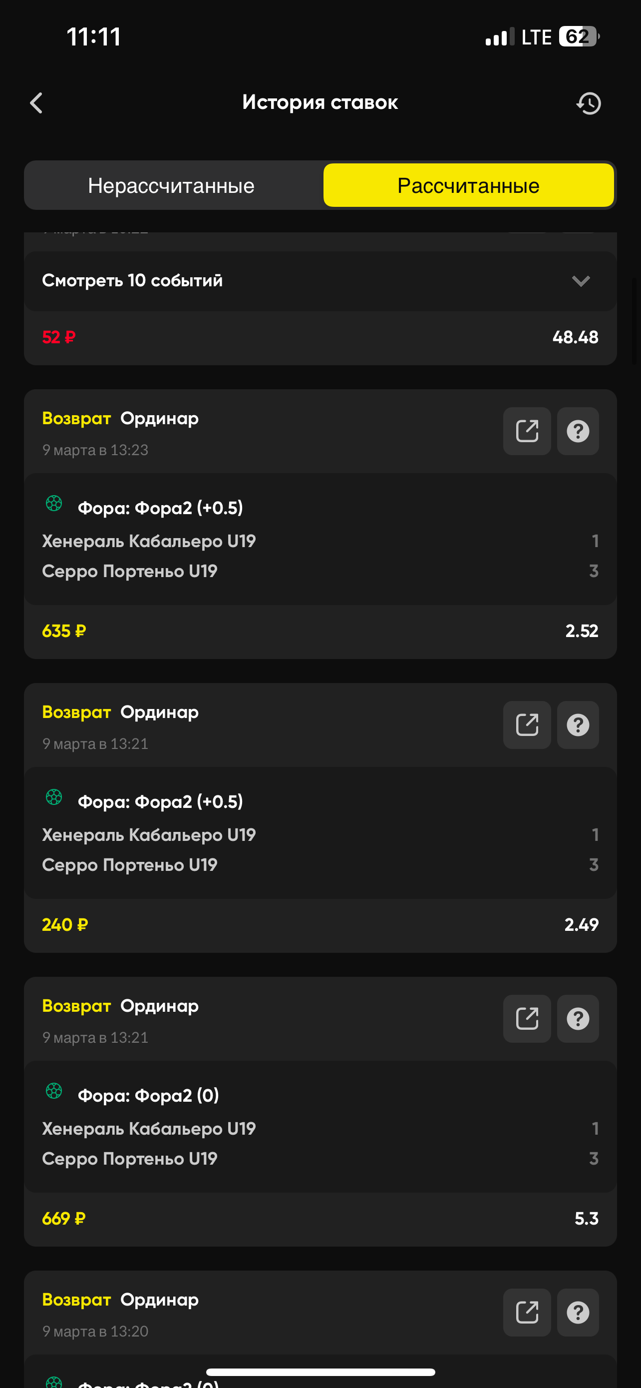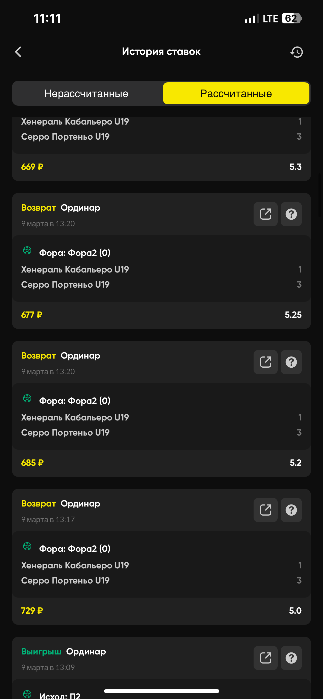 Здравствуйте, ставил ставку 9 марта ф2(0) на футбольный матч Хенераль Кабальеро u19 - Серро Портеньо u19, ставил когда команда проигрывала 1-0, во втором тайме первая команда получила красную карточку, и в конце матча вторая команда отыгралась и вышла вперёд, после матча , мне сделали возврат, хотя моя ставка сыграла, написал в их поддержку, сказали, что матч договорной и счёт был известен за ранее, но так можно любой матч отменять, чтобы просто не платить, почему они тогда вообще давали ставить этот матч и возврат сделали только после матча, а не сразу после ставки, это полный беспредел, помогите разобраться и получить свой выигрыш, я ставил честно, и рисковал своими деньгами, и честно хочу получить свой выигрыш, мой номер счета 199064