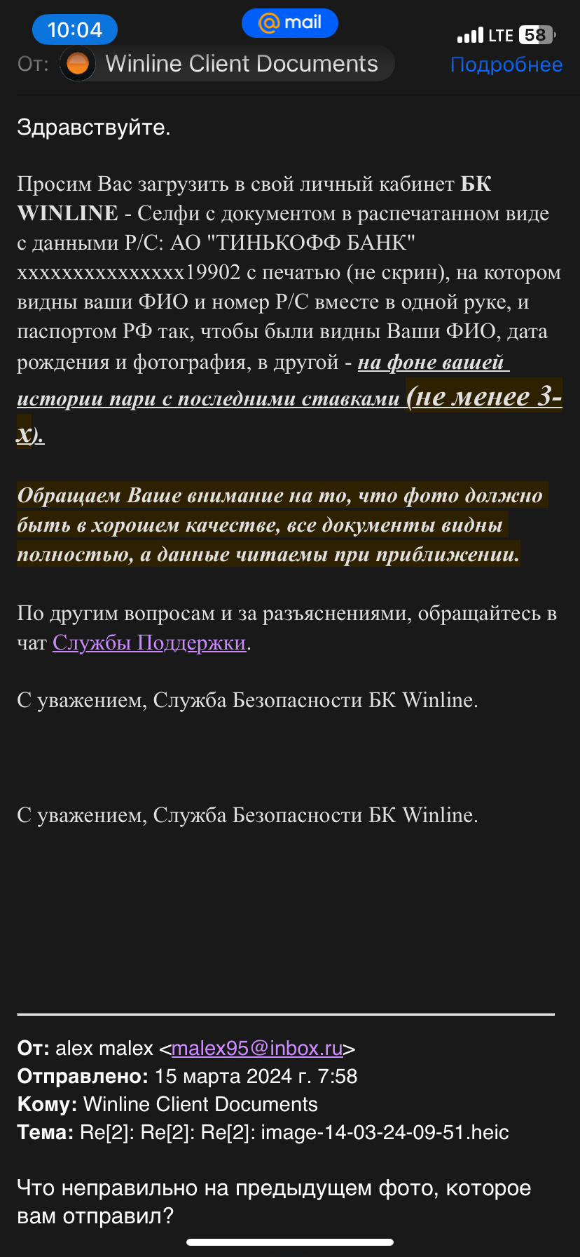 Но однозначно, после всех этих проверок (сначала фото банковской карты, паспорта, потом видео связь с этими же предметами, потом фото с распечатанным договором банка и паспортом, потом фото с распечатанными реквизитами счета и паспортом, потом эти же документы, но на фоне своих последних 4-х ставок) продолжать играть на этой платформе никакого желания нет. Издевательская идентификация