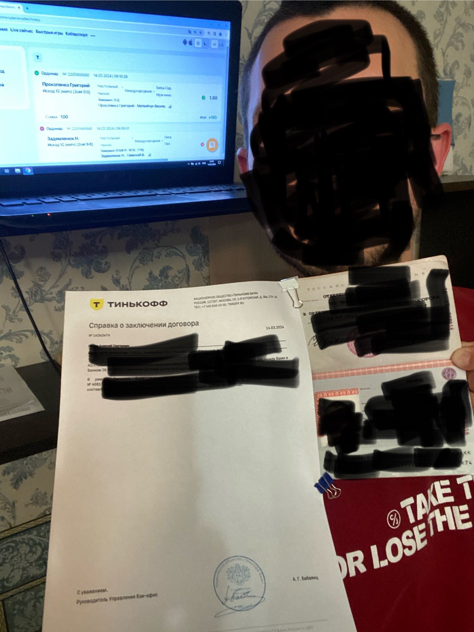 Здравствуйте. Вы лучше откройте историю ставок на телефоне и возьмите его в руку. А в другую руку - вашу конструкцию из паспорта и договора. И попросите кого-нибудь вас сфотографировать. Так будет лучше все читаться и документы полностью в кадр попадут.