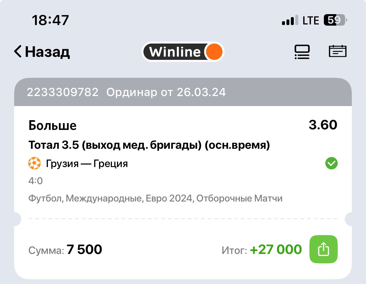 В матче Грузия - Греция . Я поставил Тотал 3.5 больше выхода мед бригады в основное время. В основное время мед бригада вышла 4 раза : 13, , 23, 59, 83 минута. Но мне засчитали поражение.