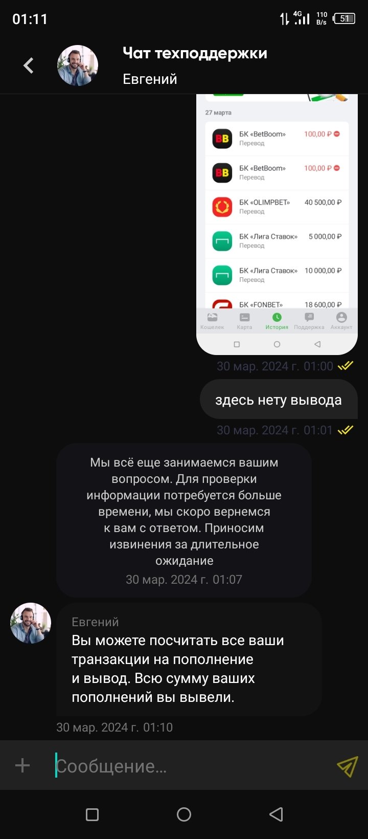 Здравствуйте, видеоверификацию прошла, видимо неудачно (заблокировали вход). Попросила вывести хотя бы депозит, на что получила ответ, что "Вы можете посчитать все ваши транзакции на пополнение и вывод, всю сумму ваших пополнений вы вывели"