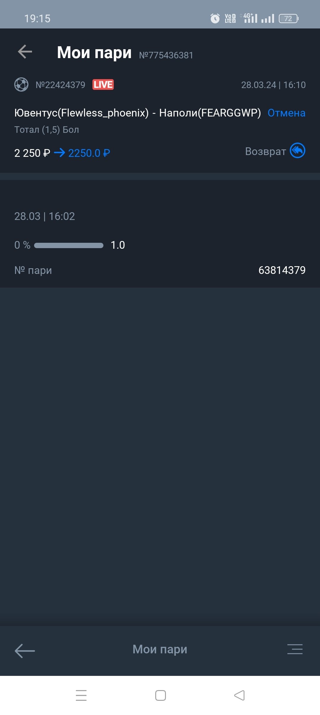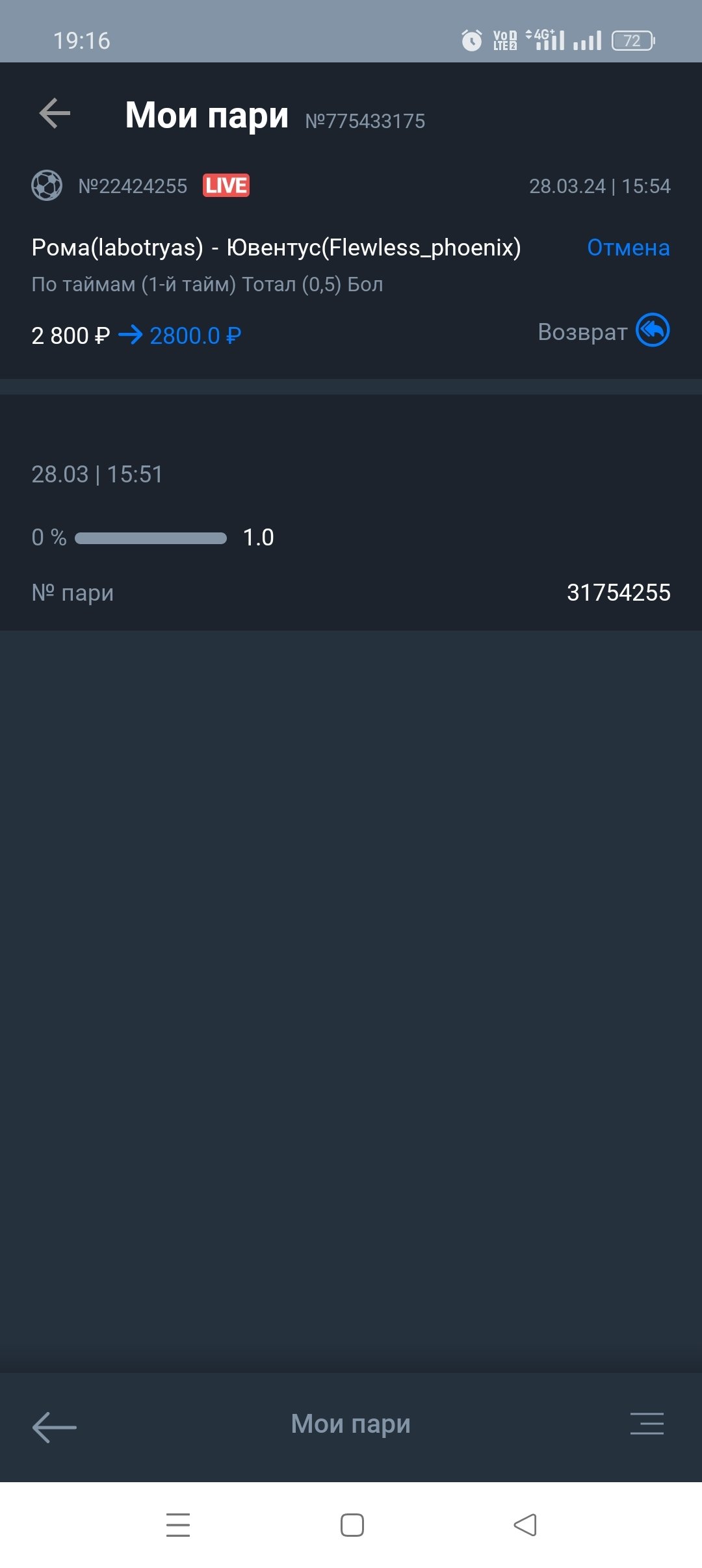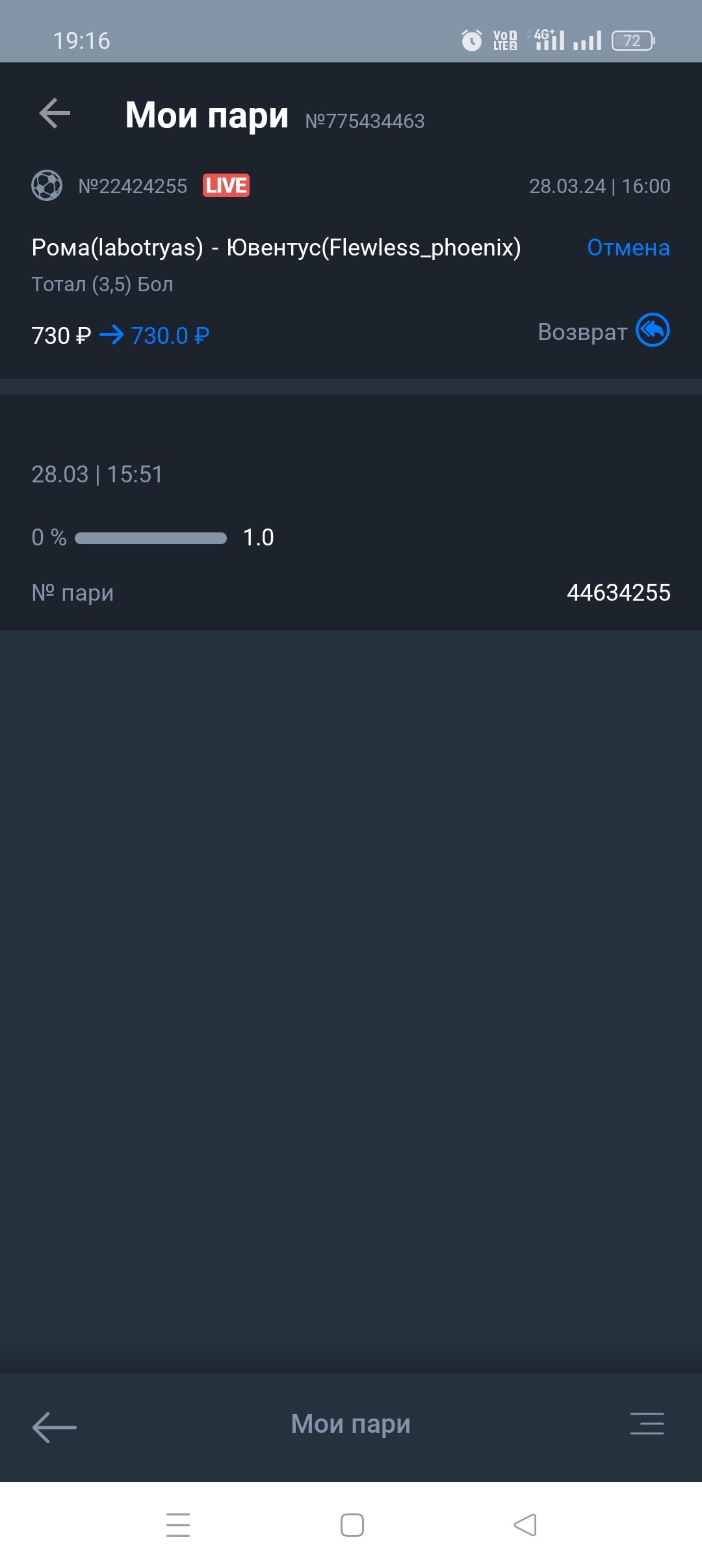 По информации от букмекера, ставки рассчитаны возвратом по причине того, что они совершены на уже известный результат. Возврат ставок в рамках правил.