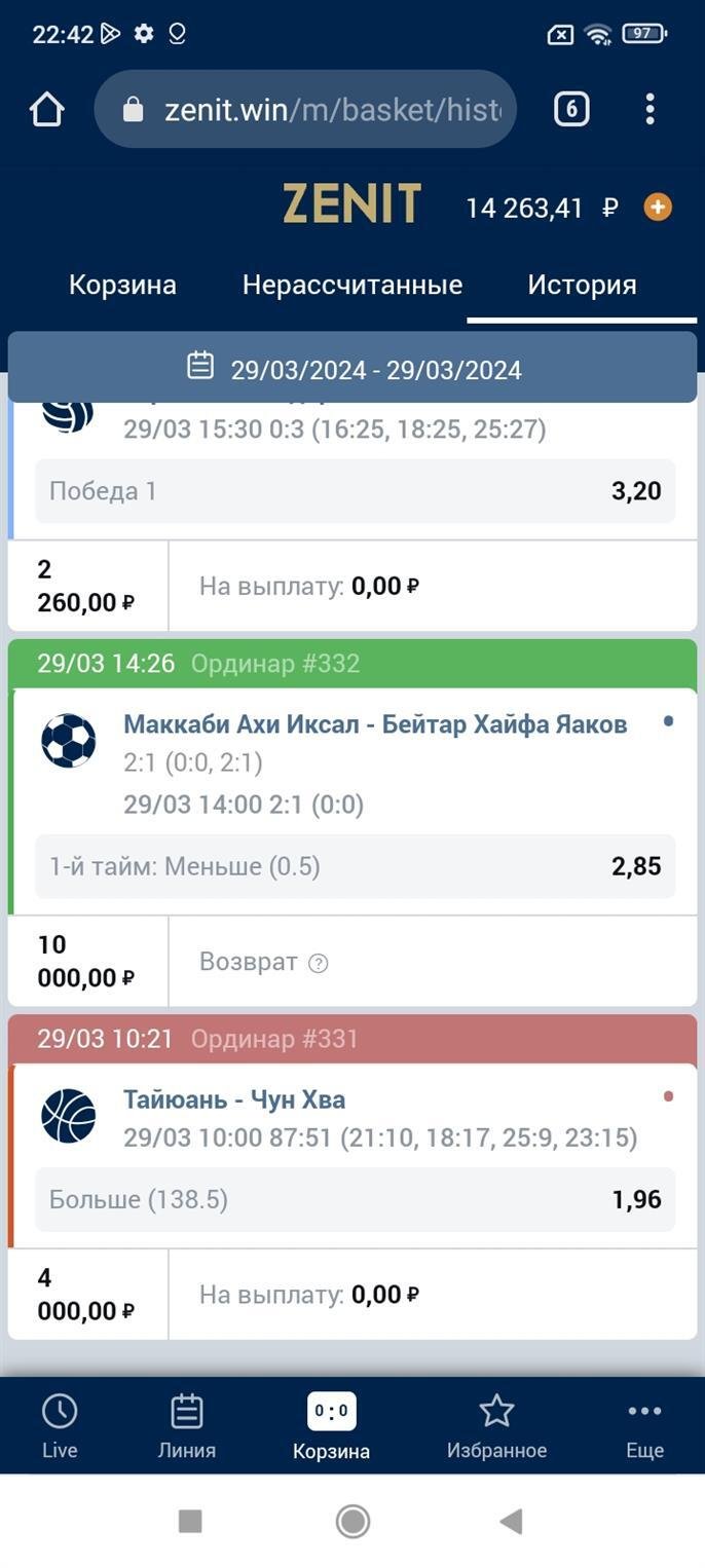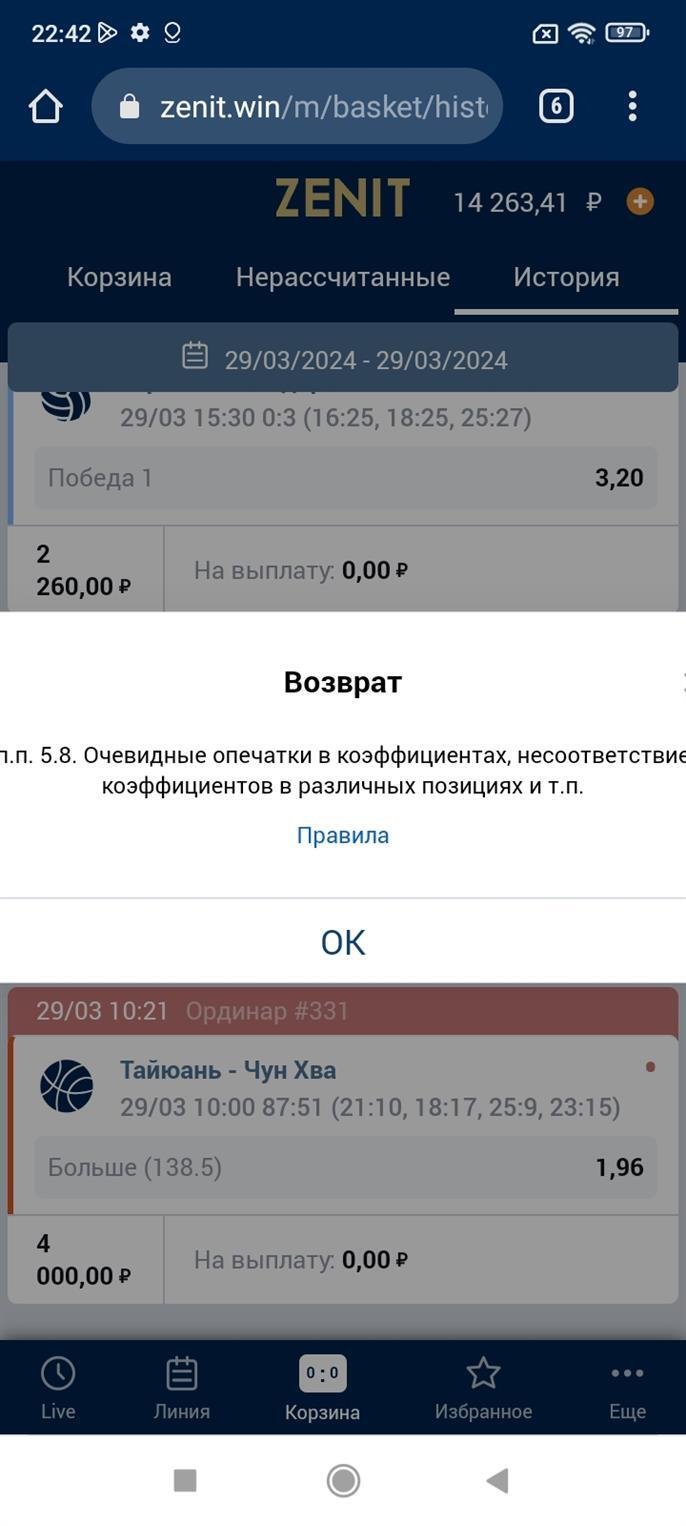 Поставил в live на футбол чемпиона Израиля Маккаби Ахи Иксал - Бейтар Хайфа Яаков тотал меньше 0.5 в первом тайме на 12 минуте матча коэфициент - 10000рублей. Ставка выиграла выигрыш по ставке вначале сразу зачислили. Чуть позже отменили выигрыш посчитали возврат, таким образом решив меня 18500 рублей моих выигранных денег. Это самый мой крупный выигрыш у этого букмекера. Букмекер ссылается на п.п.5.8 (Очевидные опечатки в коэфициентах), это не соответсвует действительности. Другие букмекеры давали примерно такие же коэфициенты на эту ставку. Даже исходя из логики ставка на тотал меньше 0.5 в первом тайме на 12 минуте матча с коэфициентом не может быть явной ошибки. Никакой явной ошибки в коэфициентах не было. Прошу повлиять на букмекера с перерасчетом ставки на выигрыш.