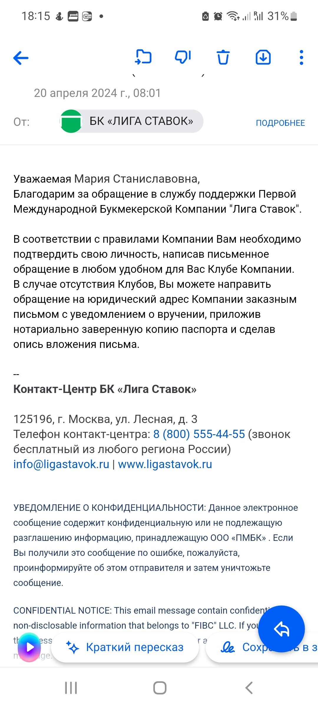 Зарегистрировалась на бк лиге ставок. Дали фрибет . Поставила его, он отыграл . Далее поставила еще несколько ставок. Решила вывести. Появилось уведомление: Для вывода денежных средств необходимо обратиться на горячую линию. Написала в поддержку. Ответили, что на аккаунте ограничения и отправили в офис писать обращение. Никаких нарушений с моей стороны не было. Идти в офис я не могу по причине того, что по месту моего проживания (Республика Крым) нет клубов компаний. Покинуть полуостров в поисках ближайшего офиса я не имею возможности. Отправление натариальнозаверенной копии моего паспорта является для меня категорически не приемлемым вариантом! Так как не желаю стать жертвой утечки личных данных. Настоятельно прошу предоставить мне возможность пройти верификацию онлайн. Получить ограничения просто так очень не приятно. Прошу уважаемую администрацию Легалбет помочь мне пройти любую форму верификации онлайн, почитав отзывы видела , что с вашей помощью такие прицинденты были. P.s Спасибо большое