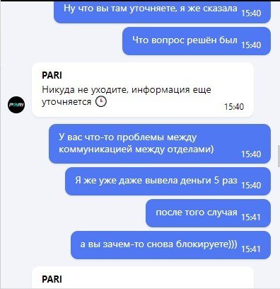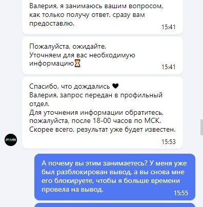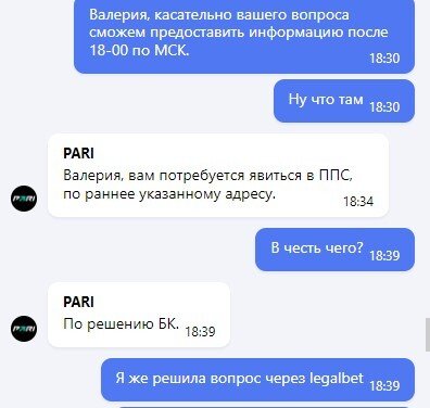 Меня отправляли в москву, не принимали заявление на отказ. Блокировали вывод вне правил. Написала жалобу, вывод средств одобрили и разрешили выводить. Спустя неделю блокируют вывод и снова зовут в ППС МСК, хотя вопрос уже решён и я даже выводила спокойно. Ставки я новые не ставила, причин блокировать вывод никаких не было. И не отвечают в связи с чем, после решения вопроса они снова блокируют вывод. Я думаю они накручивают у вас "Решенные" положительно вопросы, хотя по факту обманывают пользователей.
