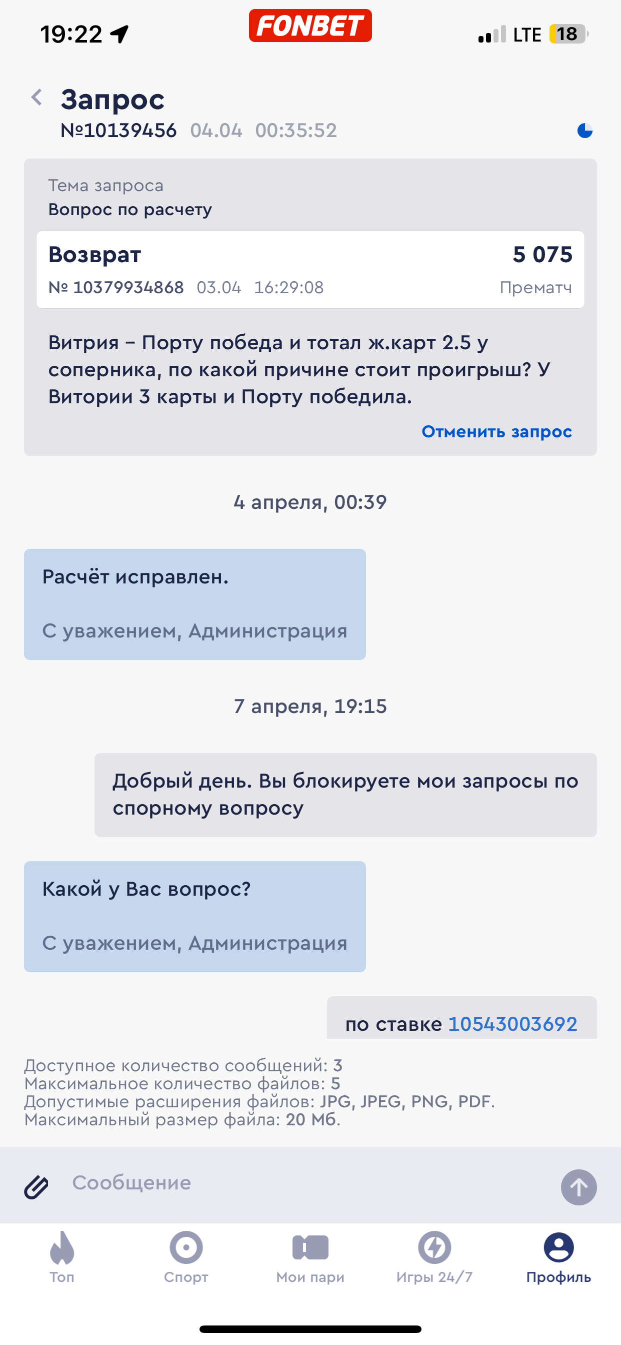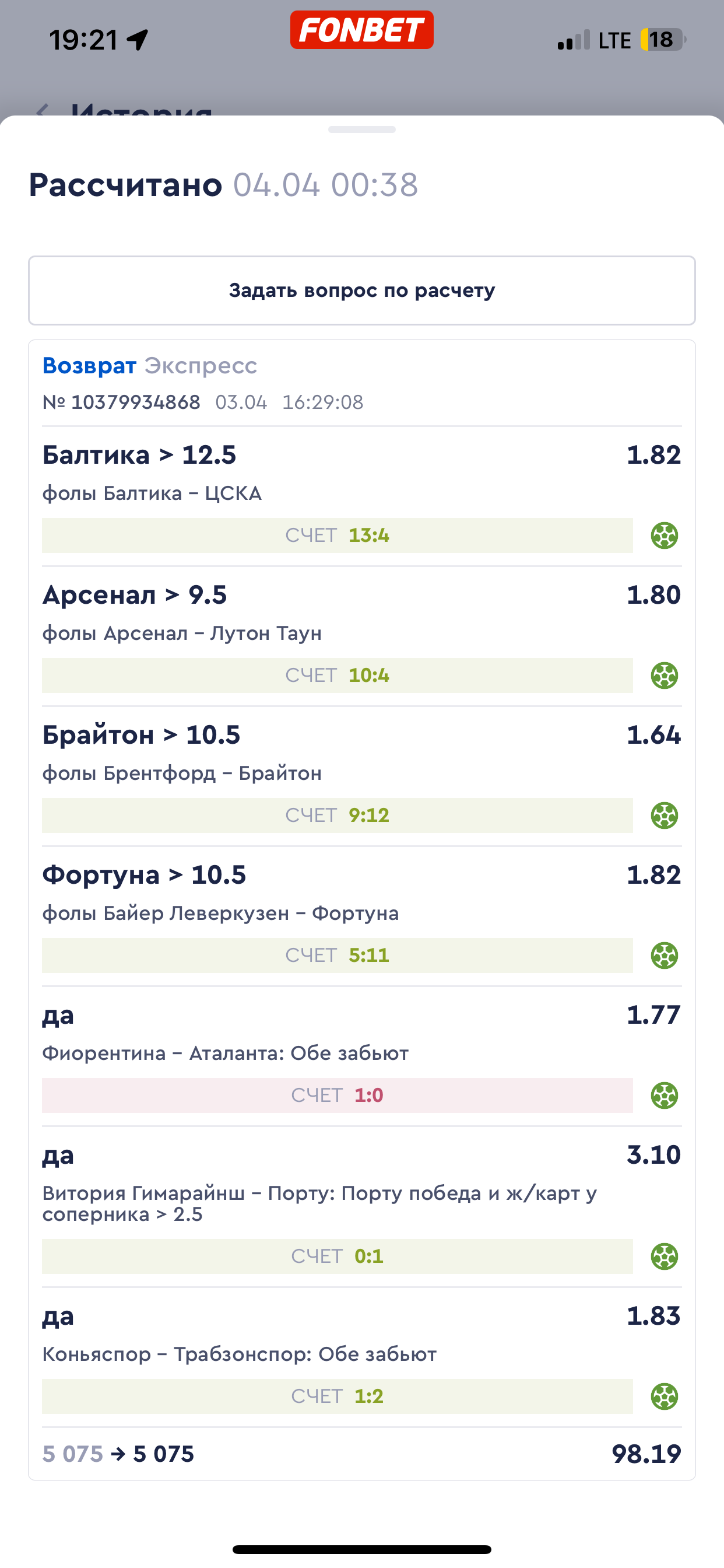 экспресс ставки ID: 10543003692 Мною была совершена ставка на ТБ 12.5 фолов у майами. Фонбет посчитал данную ставку проигрышной. По моему запросу к фонбет о предоставлении мне источника информации статистики по матчу, фонбетом был предоставлен мне сайт статистики где они взяли данные по фолам. Сайт прилагаю ниже. где указано 13:13 фолов в матче майами - колорадо. Моя ставка ТБ12.5 прошла. Администрация отказывается выплачивать мне деньги и считает экспресс проигрышным. Прошу помочь в данной ситуации так как фонбет игнорирует мои запросы. Скрины экспресса и переписки с фонбет прилагаю. Официальные Судейские протоколы по матчу 13:13 фолов. Сайт статистики предоставленный фонбетом 13:13 фолов Официальный сайт Интер Майами 13:13 фолов официальный сайт Колорадо 13:13 фолов. На всех ресурсах моя ставка прошла ТБ12.5На главном ресурсе от фонбет на который он ссылается, моя ставка выигрышная. Но у фонбета экспресс проигранный. Прошу разобраться.