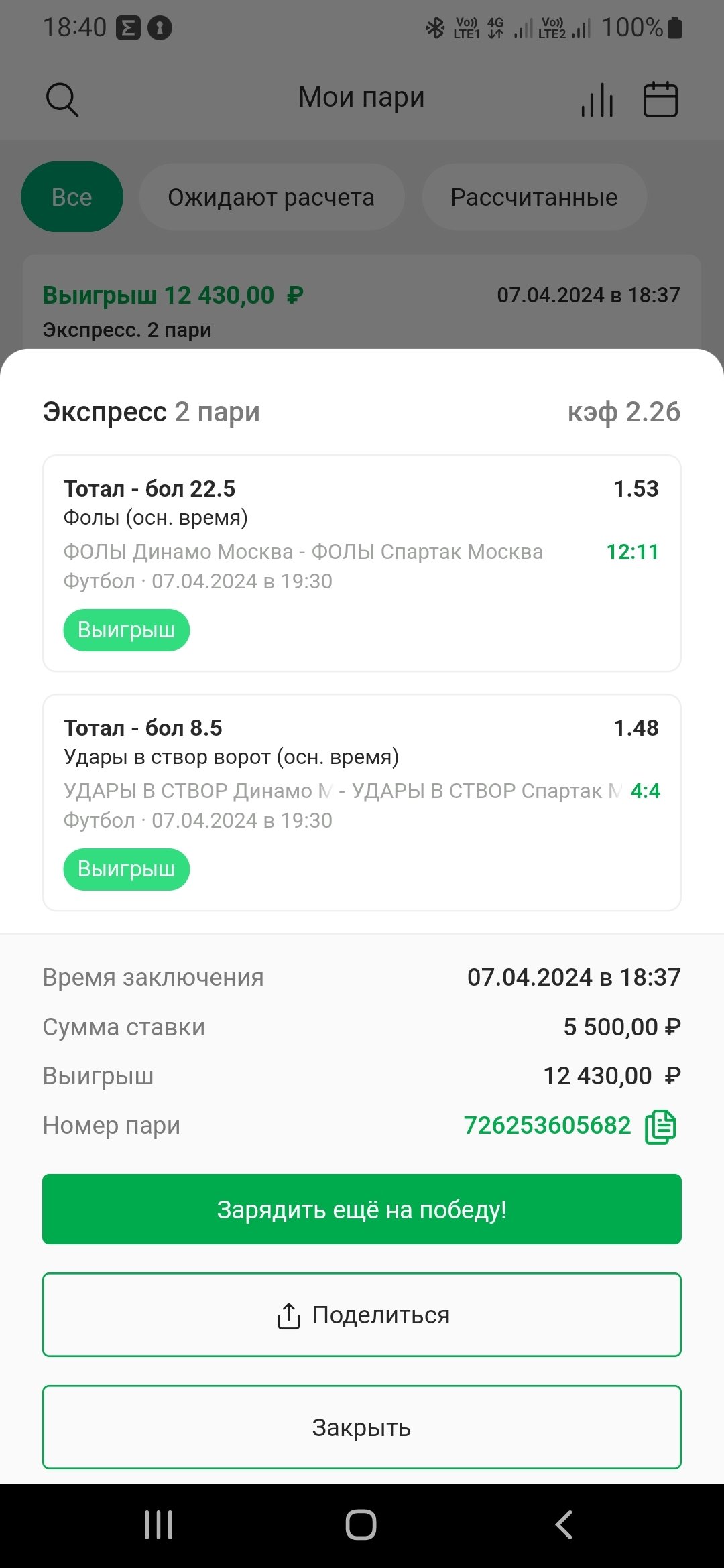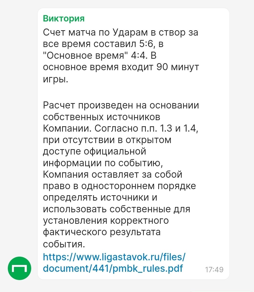 Огромное спасибо legalbet, с вашей помощью удалось восстановить справедливость. Ставку пересчитали, результат выигрыш. Еще раз благодарю!!!